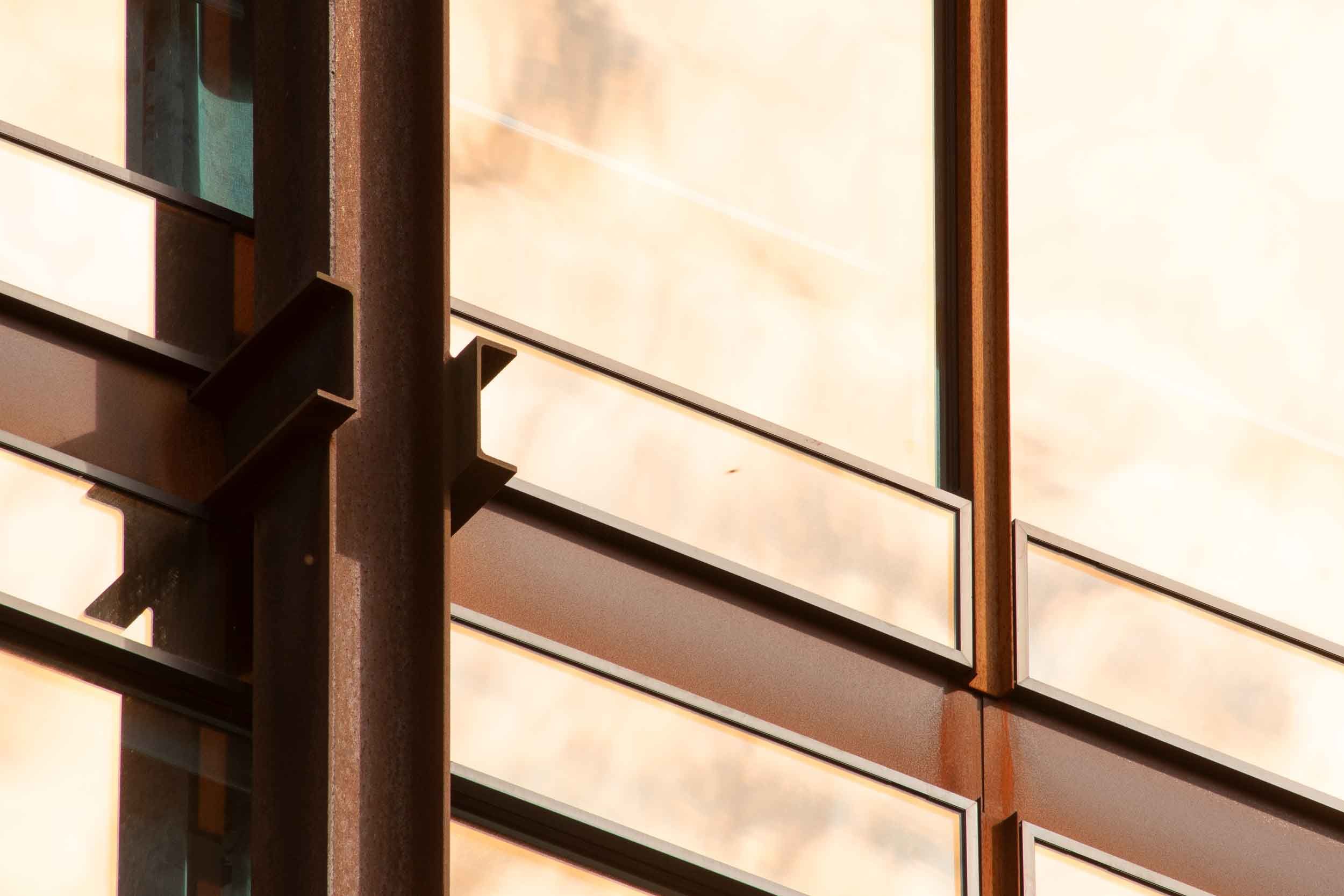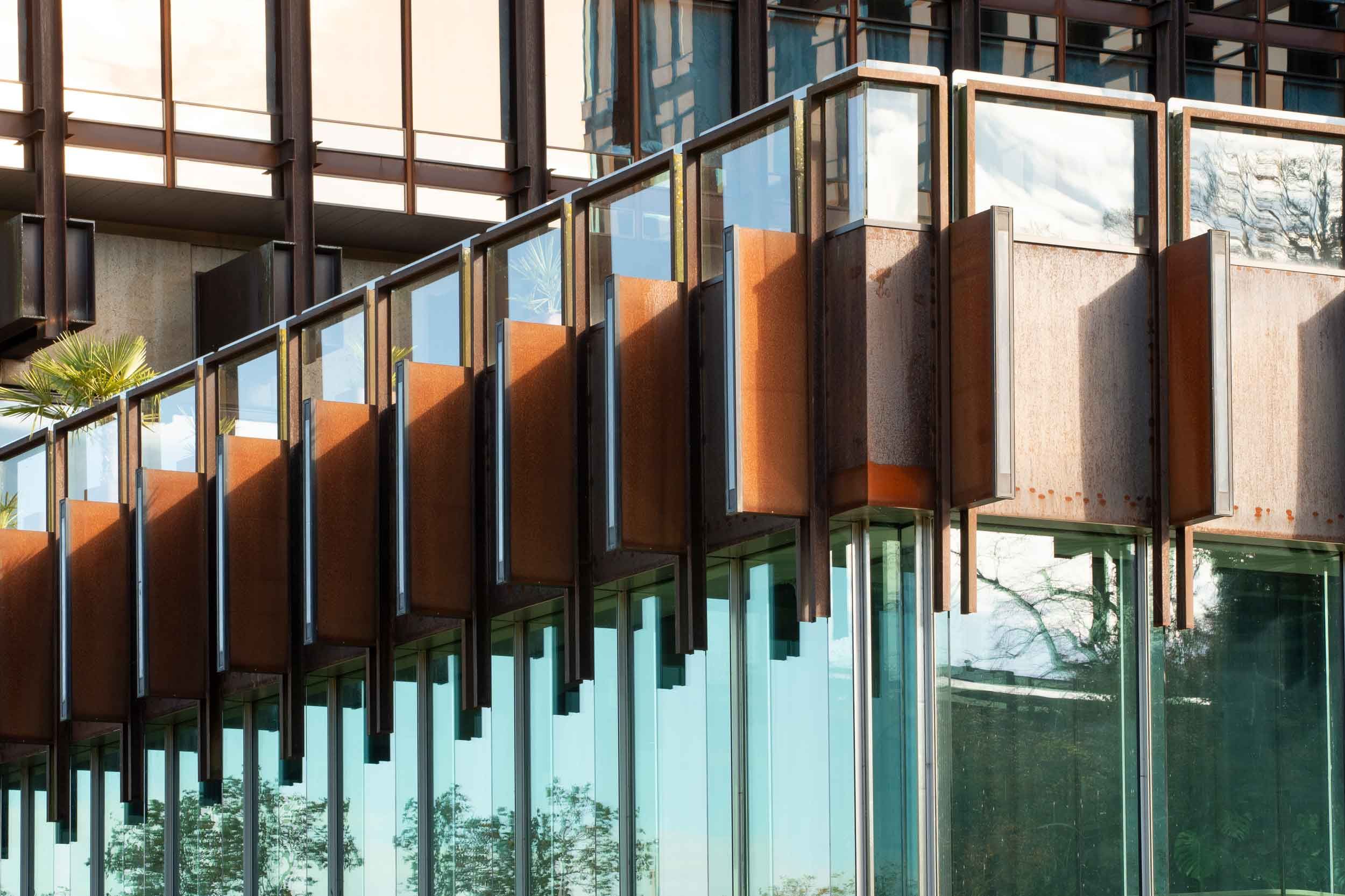 De originele buitengevel van weervast staal (‘corten’) bleef behouden. De interventie waarrond het ontwerp opgebouwd is, is een cirkelvormige vide die centraal in het plan gecreëerd wordt. De nieuwe hal, met een diameter van bijna 21 m en drie verdiepingen hoog, scharniert tussen voor- en achterbouw en verbindt zo de parking met het hotel en de kantoren.