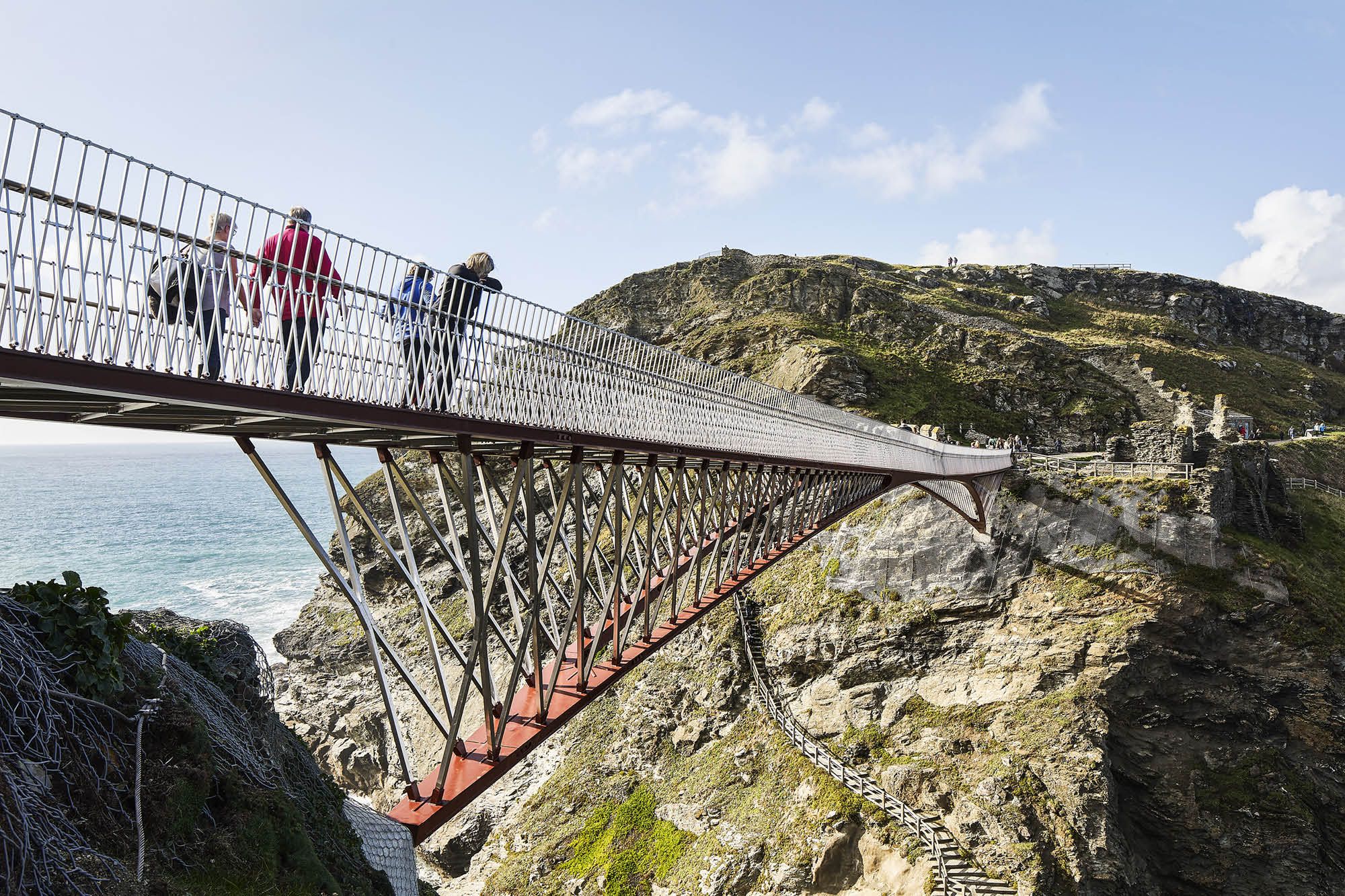 La passerelle piétonnière du château de Tintagel est basée sur un concept simple : rétablir le lien qui existait autrefois et combler le vide. Au lieu d’insérer un troisième élément qui touche les deux côtés, deux parties saillantes séparées qui se rejoignent presque au milieu ont été construites. La nouvelle passerelle améliore l’expérience du lieu pour le visiteur. La route de l’entrée principale passe par le portail intérieur historique et offre une vue spectaculaire sur les ruines du château et l’île de Tintagel. La passerelle a une longueur totale d’environ 70 m. La structure de 4,5 m de haut sortant de la paroi rocheuse est réduite à une épaisseur de 17 cm au centre.