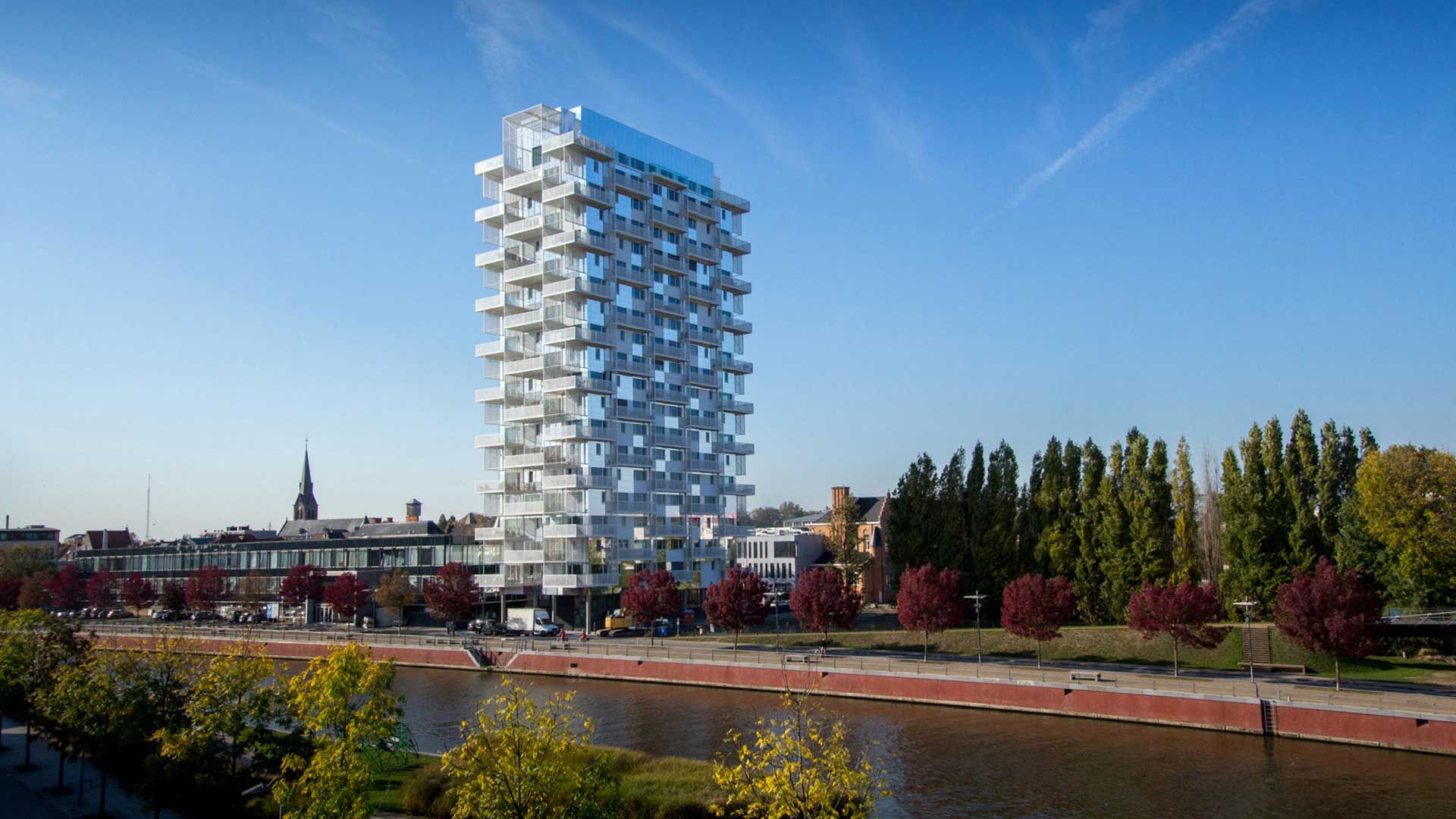 Avec ses 11.348 m², la K-Tower redéfinit non seulement l’horizon de Courtrai, mais également le paysage des développements résidentiels en Flandre. La mise au point patiente et précise du plan général de la tour et de son noyau de circulation, du plan des appartements, de ses façades, des terrasses en tôles perforées, du hall d’entrée coloré, ont fait l’objet de nombreuses réunions, tant de brainstorming que d’études d’exécution. Le résultat : 65 appartements sont disposés sur 22 étages tout en occupant une surface au sol très restreinte de 480 m² !