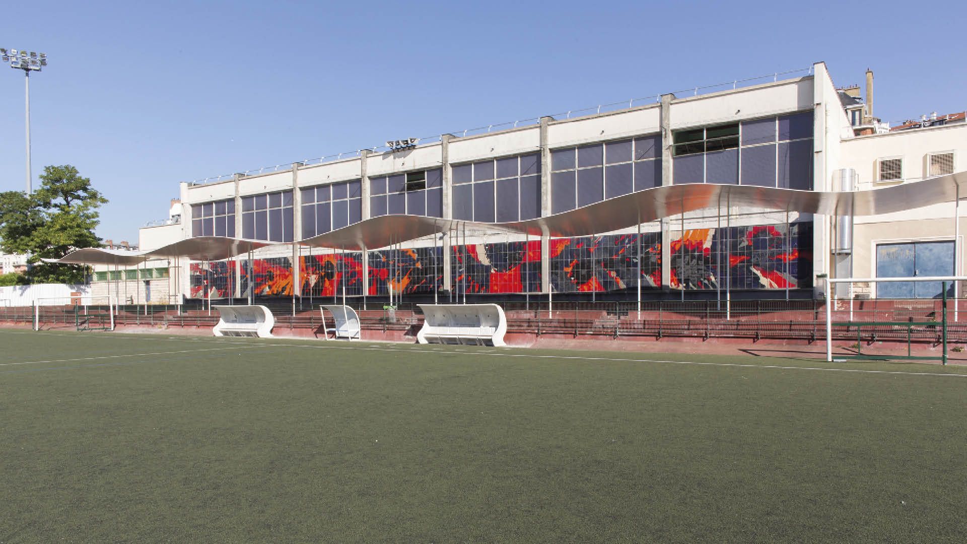 Ayant pour fond une grande mosaïque rouge et noire, l’architecte trace une ligne ondulée apposée sur une série de fines petites pattes ; un abri recouvrant une tribune existante de 50 m de long. Le dessin est tout simple : une tôle de 15 mm d’épaisseur et 45 colonnes de support en acier de 55 mm de diamètre sont disposés de façon plus ou moins aléatoire sur les trois gradins que comportent la tribune. La courbe a été optimisée pour éviter le flambement dû à la poussée latérale causée par le poids des tôles. Celles-ci ont été cintrées en atelier et assemblées sur place en dix parties de cinq mètres sans que les fixations entr’elles ne soient visibles, grâce à l’utilisation de boulons à tête fraisées enfoncés dans les tôle qui en leurs extrémités se chevauchent à mi-épaisseur. Les colonnes doivent soutenir la toiture à la fois verticalement et horizontalement. Comme les 15 colonnes de la rangée de devant se trouvent approximativement au milieu de l’auvent qui fait 5 m de profondeur, elles en supportent presque tout le poids. En revanche, les colonnes situées à l’arrière, qui ne portent qu’une faible proportion de la charge, réagissent de manière plus rigide aux poussées horizontales et font office de contreventements.