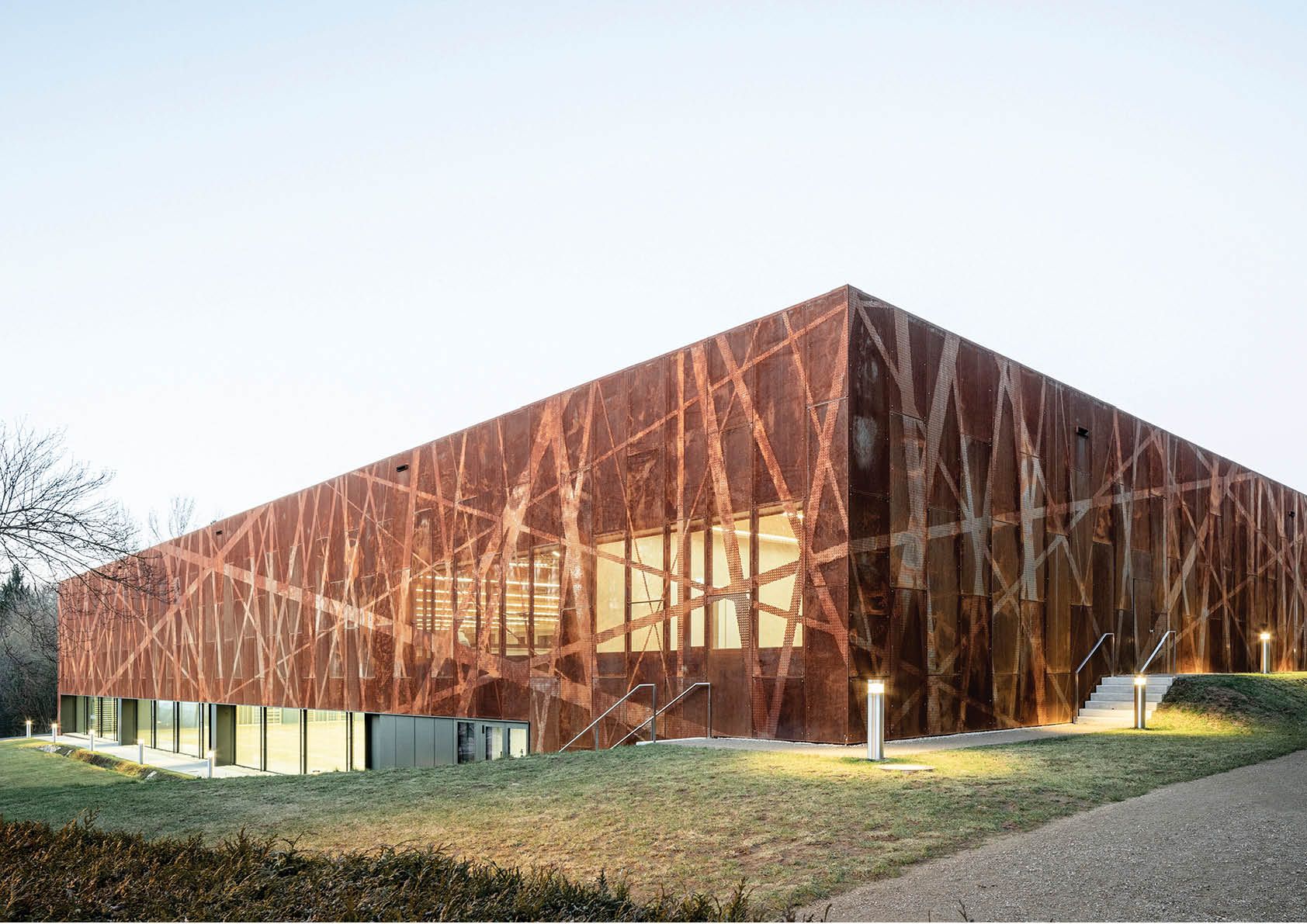 Le hall sportif de 3000 m2 est revêtu d’une façade composée de panneaux d’acier auto-patinable (corten) perforés. Inspirée de la nature et des bois environnants, la façade en acier corten exprime ainsi parfaitement l’aspect naturel et brut recherché, en plus de son aspect économique et de sa durabilité dans le temps. Les perforations créent une image de bandes entrecroisées de différentes largeurs. Chaque panneau métallique perforé est unique afin de garantir la continuité des motifs. À l’intérieur du bâtiment, le motif végétal se poursuit. Dès l’entrée, une vue dégagée s’ouvre sur les sièges des spectateurs et le terrain de sport en contrebas. Derrière les gradins, les perforations restent visibles des usagers. Cela participe à créer une ambiance lumineuse singulière et à filtrer les vues vers la rue. Les ouvertures dans l’enveloppe du bâtiment, qui sont inhabituellement généreuses pour une salle de sport, ont été placées de manière ciblée et renforcent ainsi la conscience de l’environnement.