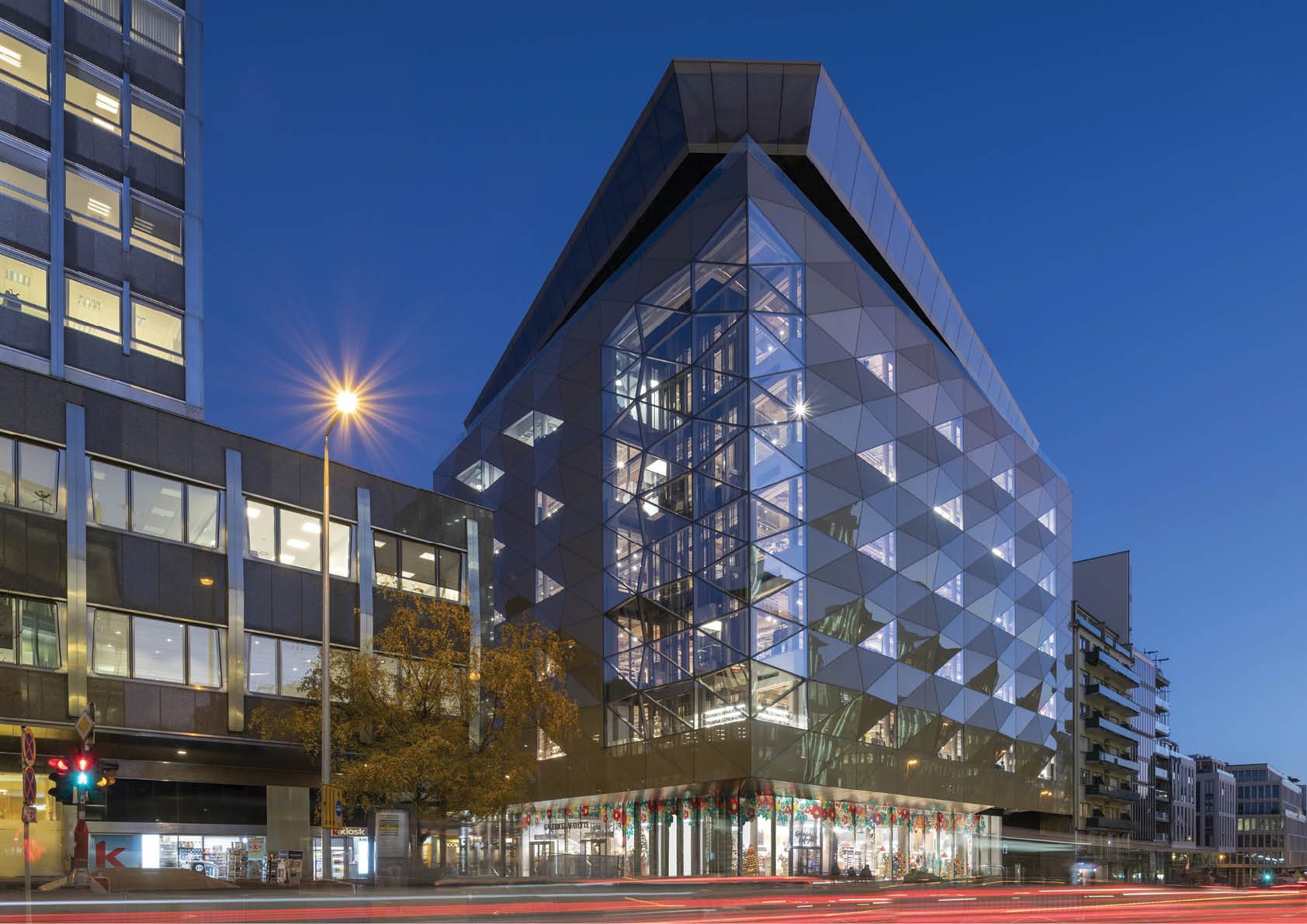 Le Royal-Hamilius est un projet mixte logements-bureaux-commerces de 5 bâtiments, dont l’emblématique B1 accueille les Galeries Lafayette. L’immeuble se caractérise par une façade non structurelle en acier ayant la forme et l’aspect du diamant. Il s’agit d’une façade reportée sur une charpente métallique. La façade principale est fixée à la structure porteuse du bâtiment en béton armé. 97 tonnes d’acier S355JR pour la façade et 22 tonnes pour la verrière coiffant l’atrium central ont été utilisées, essentiellement des profils tubulaires de dimension standard. Le choix de l’acier est principalement dû à la très grande distance entre les profils verticaux de la charpente – une portée horizontale de 9,09 m – qui rendait impossible l’utilisation de l’aluminium. Le restaurant ‘rooftop’ occupe les 2 niveaux supérieurs. Sa charpente métallique (54 tonnes d’acier S355JR) est un véritable objet d’art à elle seule, car rien, même pas les colonnes, n’est vertical.