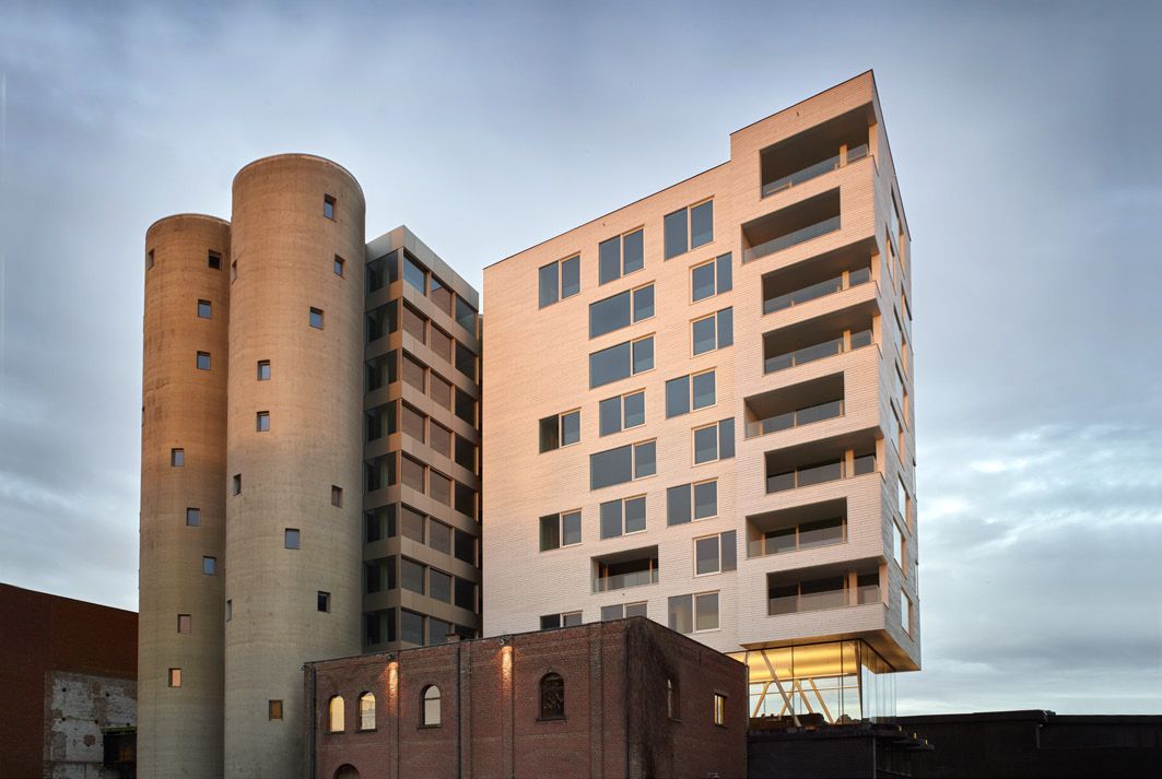 La nouvelle tour résidentielle des silos de Wijnegem est supportée par un réseau de colonnes en béton. La relation entre les deux constructions est un espace vitré dont l’importance est soulignée par quatre lignes de colonnes en acier placées en biais. Celles-ci combinent trois fonctions structurelles : elles assurent la stabilité horizontale, elles sont « l’interface » entre la construction inférieure existante et la nouvelle construction supérieure et elles redistribuent les charges de colonne de la construction supérieure.