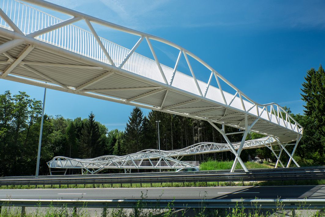 La passerelle blanche pour vélos au-dessus du Westerring de Genk se remarque surtout par son aspect tourbillonnant. Deux éléments tubulaires élancés serpentent au-dessus de la route, tout comme pour un rollercoaster. La forme du pont a été adaptée de manière minutieuse aux forces qu’il subit. Les arcs et les assemblages de charpente coopèrent et font en sorte d’utiliser optimalement (la force de) chaque kilo d’acier (S355 J2). Le résultat de cet exercice est une construction affinée et fluctuante.