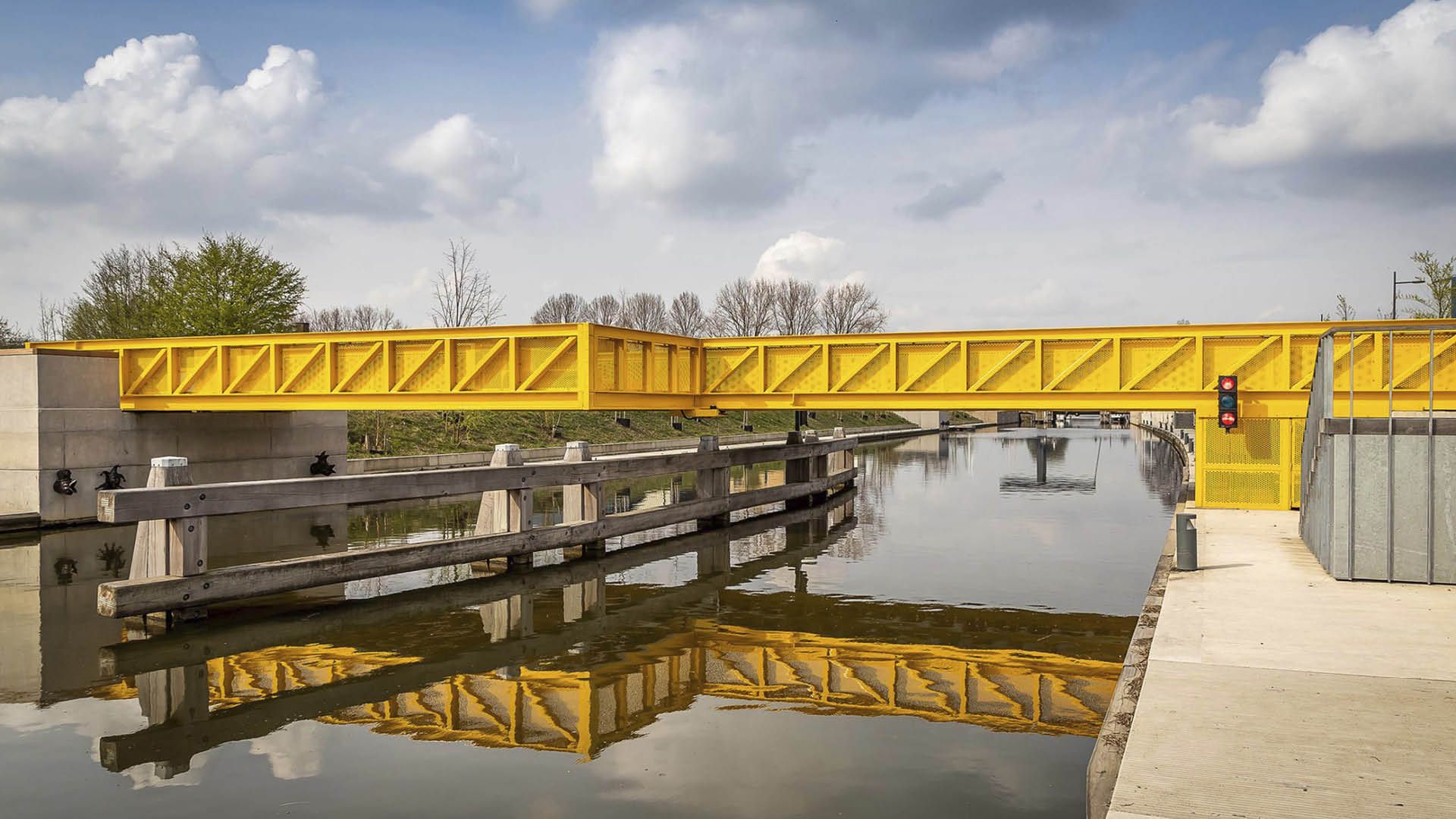Le pont roulant en acier n'est pas seulement un élément 'connecteur', c'est aussi un lieu de repos dans le Vliet à Roosendaal (NL). Caractérisé par un mode d'ouverture frappant, le pont a également un caractère industriel et une couleur joyeuse.