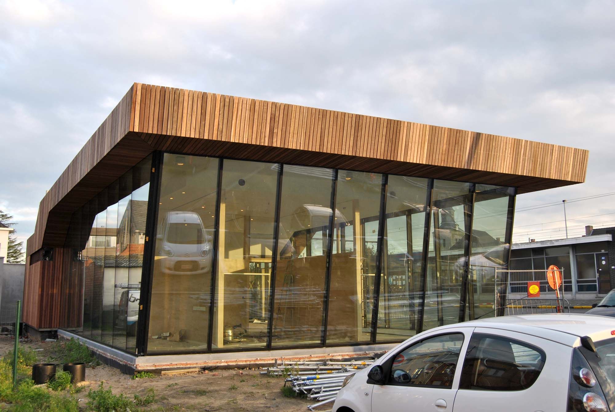 À l’ombre de la gare de Buggenhout, ces bureaux audacieux abritent une permanence de mutalité. Le choix s’est porté sur une sorte de pavillon particulièrement accessible puisque tous les espaces sont situés au rez-de-chaussée. L’utilisation de grandes verrières renforce cette impression d’accessibilité et intensifie le sentiment de se maintenir à ras de terre. Le prolongement du toit par un auvent, visuellement accrocheur, protège des surchauffes estivales. Le bâtiment se caractérise par l’absence totale de fonction porteuse dans son espace intérieur : la menuiserie extérieure en acier a été calculée de manière à ce que l’ensemble du toit soit porté par ses profilés creux en acier. La menuiserie se voit ainsi à affecter la fonction de structure porteuse. Le mur pignon incliné constituait à cet égard un défi supplémentaire, notamment parce que tous les châssis sont en triple vitrage.