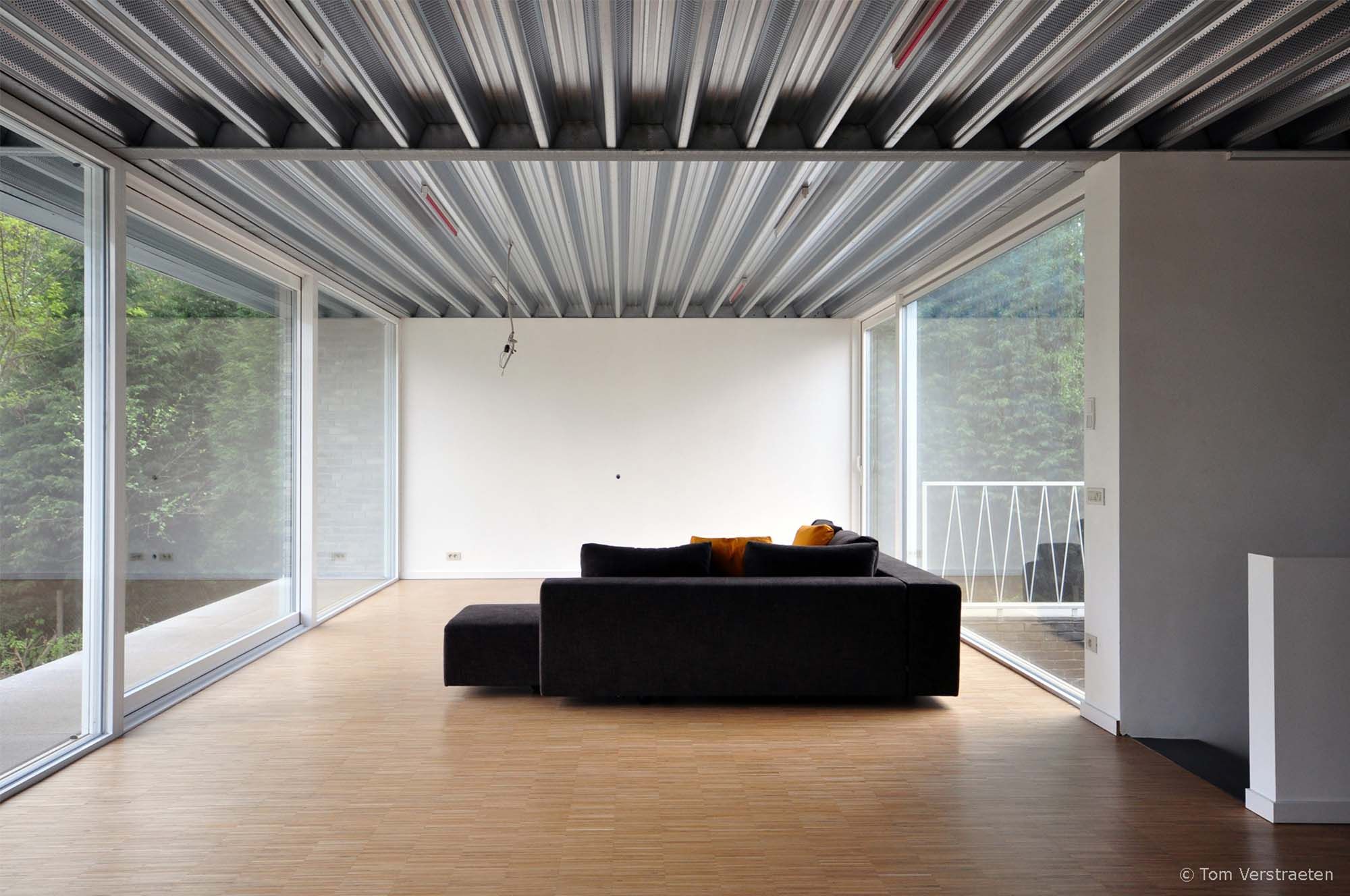 Le toit est constitué d’un panneau sandwich de confection personnelle avec Steeldeck afin de réaliser une portée maximale, mais également de préserver le caractère spécifique d’un bungalow. La couche inférieure est horizontale, la couche supérieure est en pente. Les perforations des tôles d’acier de la couche inférieure donnent une qualité acoustique à l’espace d’habitation. L’acier dont est fait le plafond est visible et fait référence aux case-study houses californiennes. La planche de rive en tôle d’acier émaillé blanc couronne la maison. Tous les équipements ajoutés tels que décharges des eaux, boîte aux lettres,…ont également été réalisés en acier émaillé blanc. Ainsi est créé un contraste avec les briques. Une colonne unique en RVS témoigne de la particularité de cette construction.