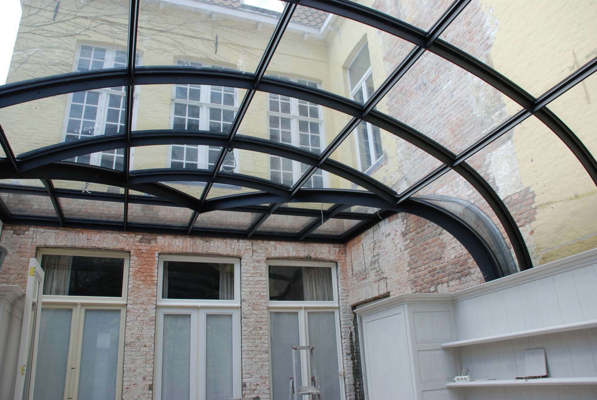 Le maître d’ouvrage de cette maison de maître brugeoise typique souhaitait agrandir son habitation avec une orangerie répondant au confort de vie actuel tout en respectant le style rétro existant. Pour cette construction vitrée en acier, l’architecte a opté pour une structure d’ailettes en acier avec assemblages à rainures et languettes. Tous les éléments ont été découpés séparément dans des tôles d’acier de 12 ou 15 mm d’épaisseur au moyen d’un laser 3D. L’acier est de qualité St 37. Ces ailettes découpées au laser constituent la base de la construction et servent aussi de gabarit pour le pliage des profils de façade en acier supportant le verre. Le système de façade en acier - Jansen Viss TVS - est constitué d’un sous-profil en acier avec caoutchoucs et nœuds d’assemblages isolés, ce qui garantit un ensemble étanche au vent et à l’eau sans ponts thermiques.