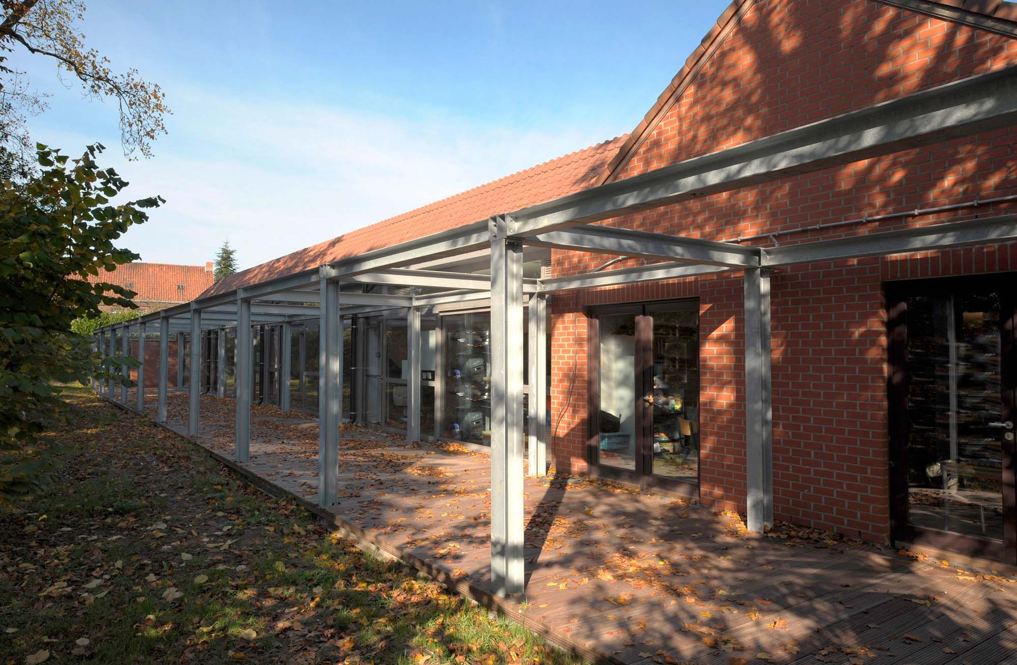 Située au cœur du village, l’extension de l’Ecole Communale d’Estaimpuis s’est opérée sous la forme d’une nouvelle construction à implanter à l’arrière du Centre de Lecture Publique d’Estaimpuis. Un parc avec quelques arbres centenaires forme le splendide décor végétal du fond de la parcelle. Les nouvelles salles de cours s’alignent sur le pignon existant, à la limite de la zone constructible pour ouvrir toutes les nouvelles classes vers le parc. Chaque classe bénéficie d’un niveau d’éclairement naturel généreux et d’un accès direct sous le préau. Sa structure métallique constituée très simplement de poutrelles galvanisées assemblées par boulonnage, rythme la façade et offre un espace couvert en dialogue avec le parc.