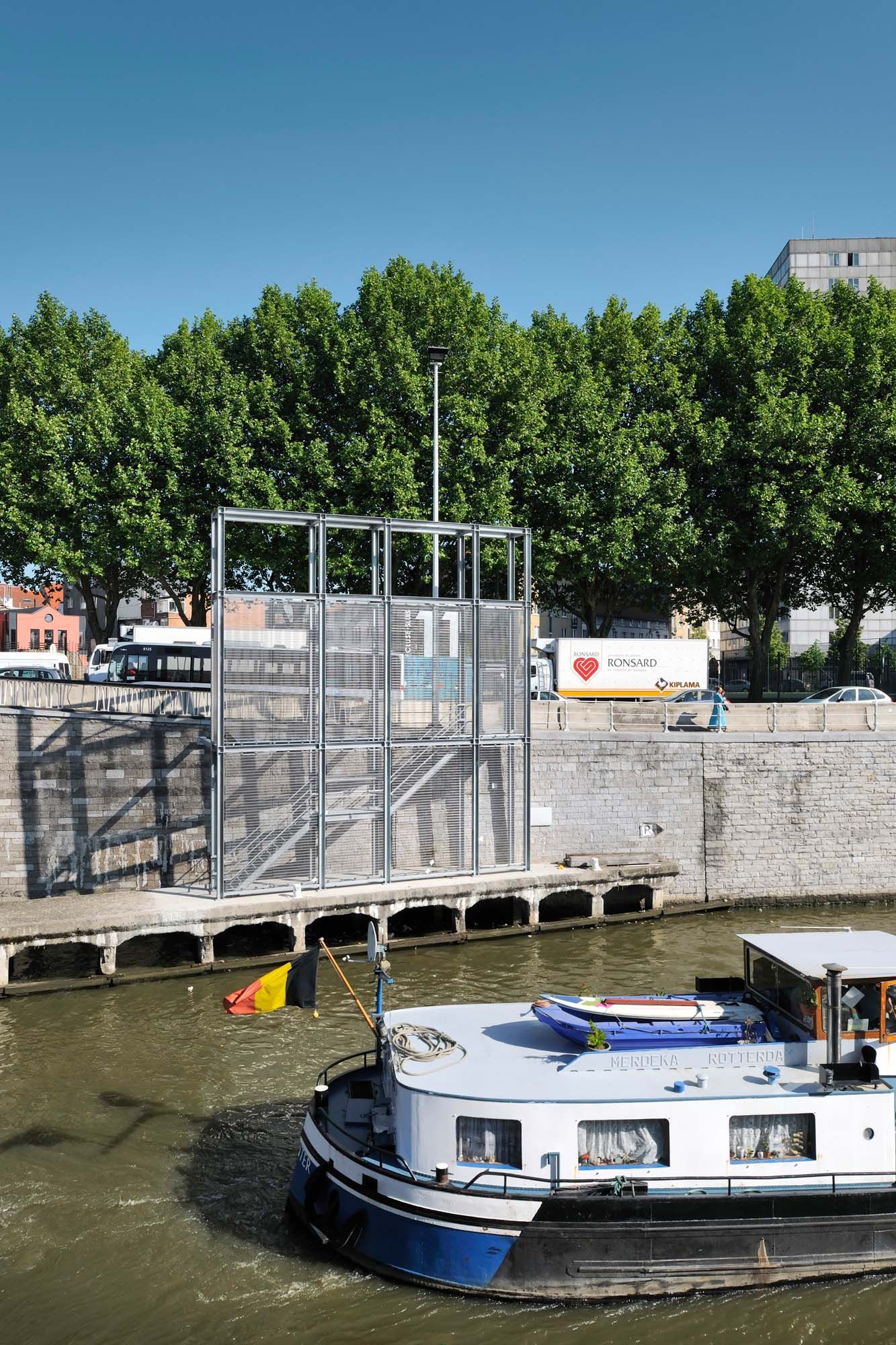 De jour, le matériau est presque transparent; de nuit, il est éclairé par un système rasant au sol de LEDs afin que la présence nocturne de l’écluse soit une réalité, créant une interface entre la ville et le canal. L’autorité du Port a profité de cette occasion pour remettre à jour les bâtiments existants : isolation, remplacement des toitures, placement d’un nouvel habillage, tout en respectant la volumétrie d’origine ayant sa propre ‘histoire’. L’acier a été choisi comme matériau des éléments structurants du projet pour donner à l’ensemble un aspect plus industriel. Une composante essentielle du projet est le tissu métallique en inox.