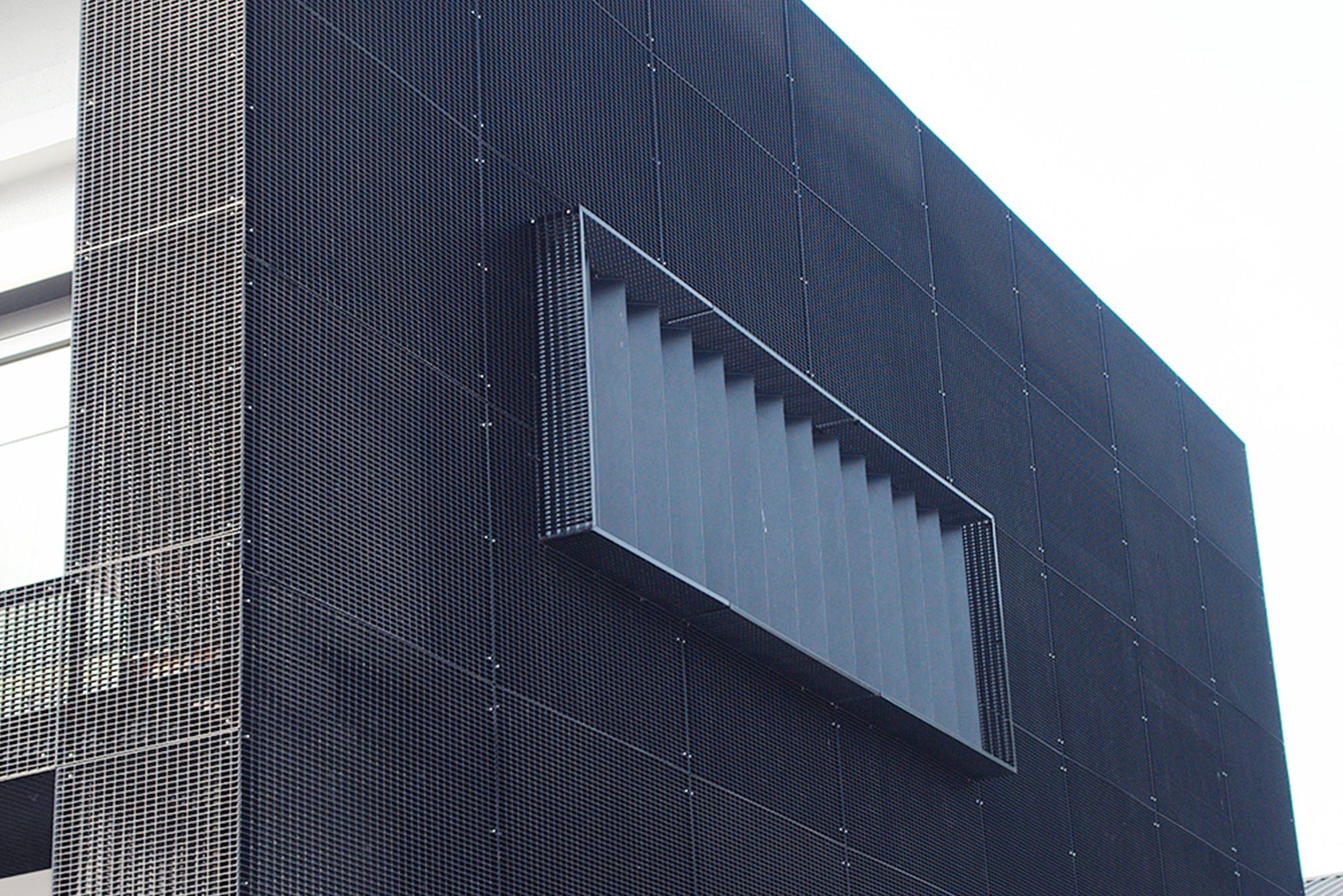 La rénovation de l’un des plus anciens garages BWM du Luxembourg avait pour objectif de lui donner une nouvelle image sans pour autant nier l’histoire de ce bâtiment datant de 1965. Comme les transformations devaient se faire sans interrompre les activités du garage, le choix s’est tout naturellement porté sur une construction métallique légère et facile à monter. La construction métallique thermolaquée est en caillebotis avec sous-construction métallique. Cette forme d’habillage de la façade la rend tantôt transparente, tantôt opaque. En fonction de la perspective, la bâtisse d’origine est donc apparente ou dissimulée, c’est selon!