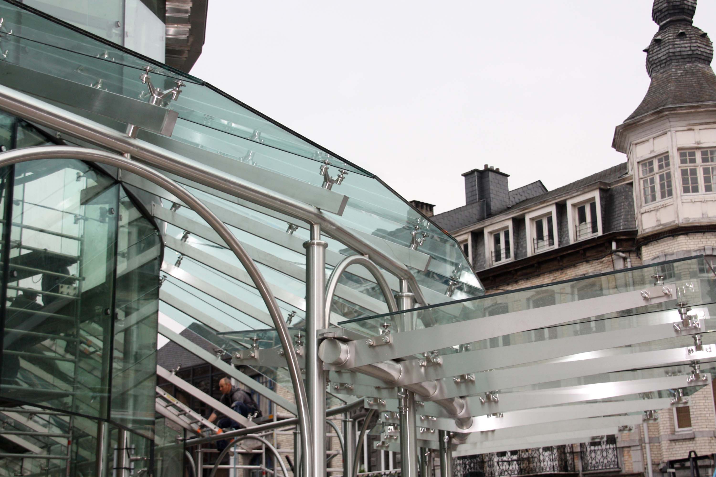 Le «Pouhon Piere le Grand» est la plus connue des sources de Spa et de sa région. Le Pavillon de la Source, de plan octogonal, est prolongé d’un Jardin d’Hiver rectangulaire. Outre les stucs et staffs intérieurs, les menuiseries originales, la reconstitution des mosaïques de sol ou la reconstitution de divers éléments décoratifs, la restauration a porté sur la mise en valeur d’une charpente remarquable. Le projet comprend aussi la reconstitution de la rotonde vitrée détruite en 1948, ainsi que du déambulatoire vitré qui le prolongeait. Sachant qu’il ne subsistait aucun élément original susceptible d’être réutilisé ou même recopié, l’auteur de projet a opté pour une composition contemporaine. Constituées de volumes de vitrage de grandes dimension posés «à facettes», la paroi verticale en forme de demi-cylindre s’appuie sur une structure en tubes d’acier inoxydable. La toiture vitrée repose sur une sablière en tube d’acier inox laquelle s’appuie sur des colonnes du même matériau. Les colonnes sont reliées entre elles par des arcs en plein cintre.
