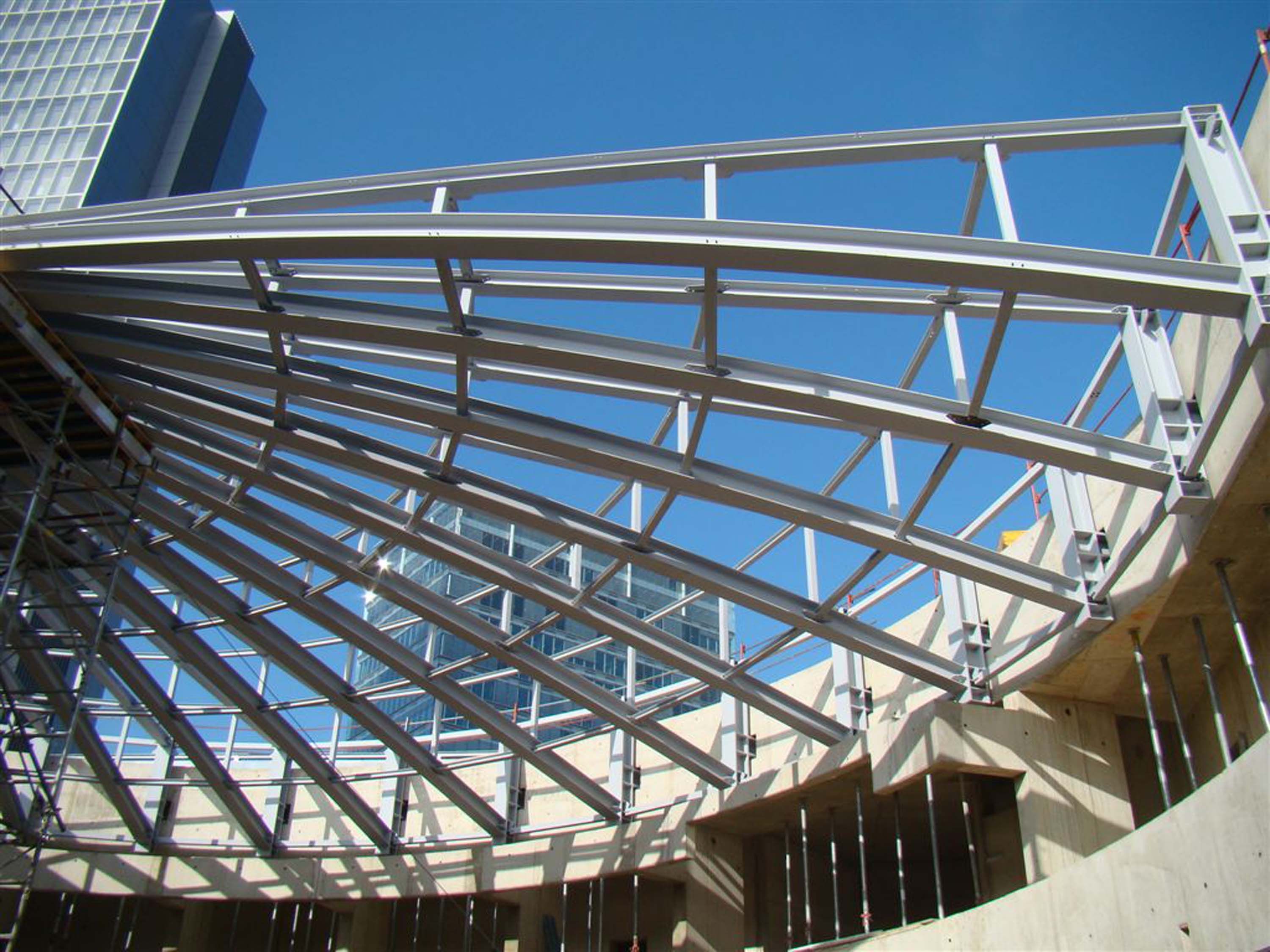 La toiture de cette salle consiste en une coupole d’un diamètre de 31,2 m formée par un système de poutrelles radiales (HEA 300) qui repose sur un anneau périphérique. Une étude de plusieurs modèles a permis de définir les efforts horizontaux en fonction de la hauteur des treillis.