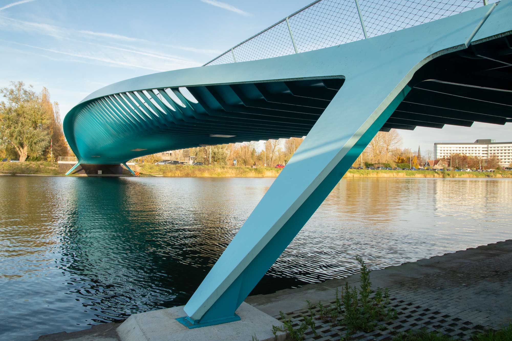 Le nouveau pont à Gand pour cyclistes et piétons fait partie de la piste cyclable rapide F400 et de la Westerringspoorroute, qui étaient interrompues par le Watersportbaan. Localement aussi, le parcours d'aviron de 2,3 km constituait un obstacle : les quartiers résidentiels étaient à peine reliés les uns aux autres et la distance jusqu'aux équipements sportifs et récréatifs était importante. Le pont, situé à mi-chemin au-dessus de l'eau, offre la solution. Le site ne nécessitait pas un pont monumental, mais un design subtil respectant les lignes de vue. La portée de 90 m demandait une structure hybride, en partie poutre, en partie arche. La section transversale se compose de trois surfaces régulières qui varient en largeur. Il en résulte un mouvement fluide et une vue panoramique. Les panneaux latéraux fonctionnent comme des poutres Vierendeel avec des ouvertures stratégiquement placées. Le concept structurel clair crée un pont transparent et durable. La structure en acier a été conservée en bleu clair et bleu foncé (contre-ombre) et le tablier est recouvert d'un revêtement en résine avec une différence de couleur pour les cyclistes et les piétons. Le pont est monolithique, facile d'entretien et a été monté en 24 heures. Il a été nommé en l'honneur d'Annie Vande Wiele, la première femme belge ayant fait le tour du monde à la voile en solitaire.