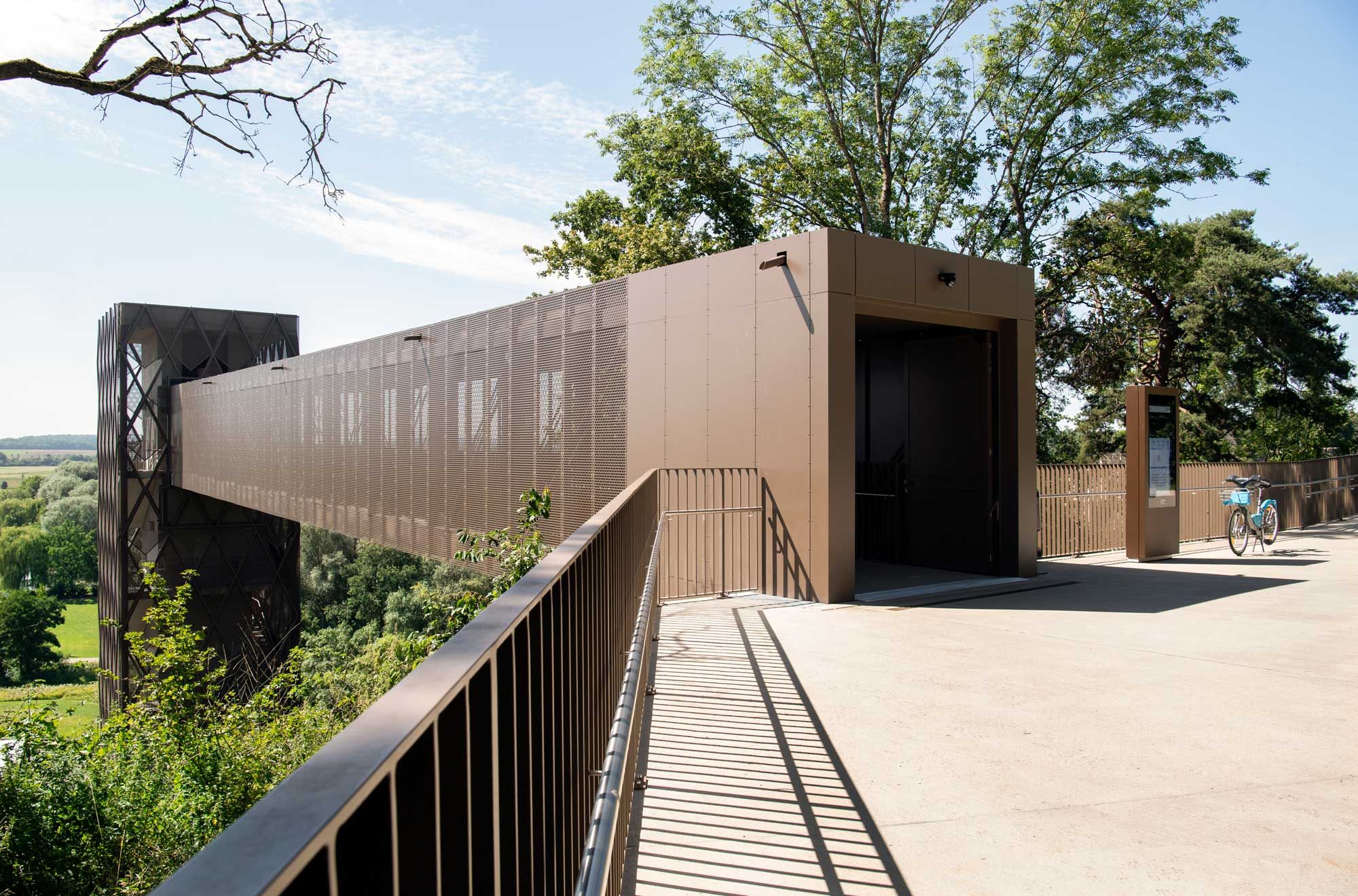La nouvelle structure d’ascenseur avec sa passerelle piétonne à Hesperange au Grand-Duché relie le centre du village au plateau Holleschbierg et constitue une initiative clé en faveur de la mobilité douce et l’accessibilité universelle. La tour d’ascenseur, haute de 35 m, précédée d’une place publique avec mobilier urbain, local à vélos et toilettes publiques, est construite autour d’un noyau en béton armé, complété par un escalier à plusieurs volées et quatre colonnes en acier galvanisé. Une passerelle piétonne en acier de 38 m de long, conçue comme une structure à travée unique, survol le versant boisé sans appuis intermédiaires et se raccorde aux cheminements existants menant au centre sportif. Les façades métalliques perforées de la tour et de la passerelle offrent des vues variées et confèrent à l’ensemble une forte identité architecturale. L’acier régional, la préfabrication, les assemblages entièrement vissés ainsi que la possibilité de rééquipement garantissent durabilité et pérennité de l’ensemble. L’ouvrage allie fonctionnalité et respect du paysage devenant ainsi un projet d’infrastructure emblématique.