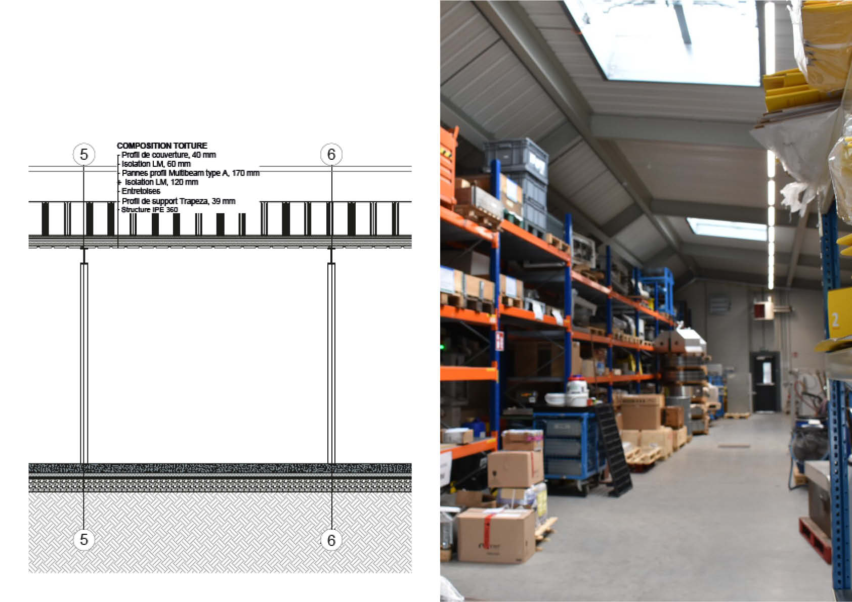 In deze nieuwe opslaghal van 260 m² kan het Centre de Recherches Métallurgiques zijn producten in de kijker zetten, ongeacht of ze reeds verkrijgbaar zijn op de markt of zich nog in het onderzoeksstadium bevinden. Het nieuwe gebouw, dat grenst aan de bestaande hal, is opgetrokken uit een metalen skelet van ongeveer 14 ton. Dit laatste bestaat uit zes warmgewalste S235-stalen portieken met een asymmetrisch profiel.