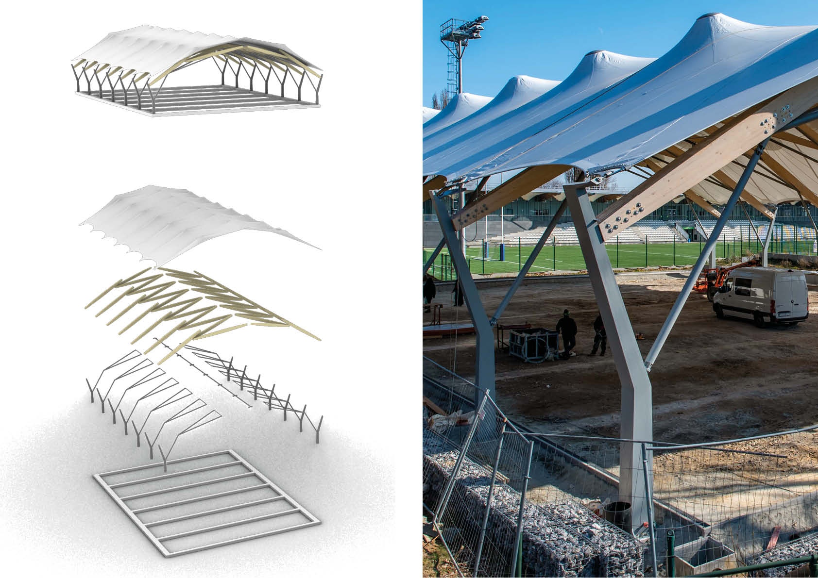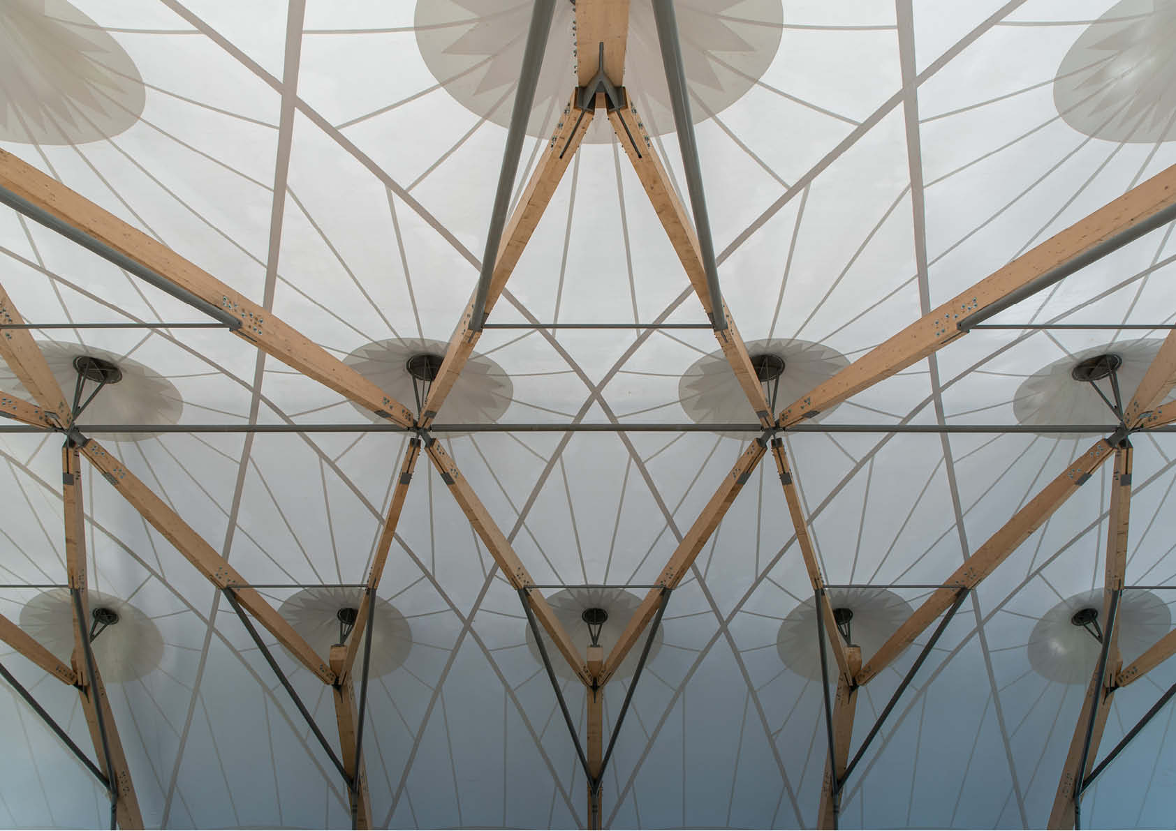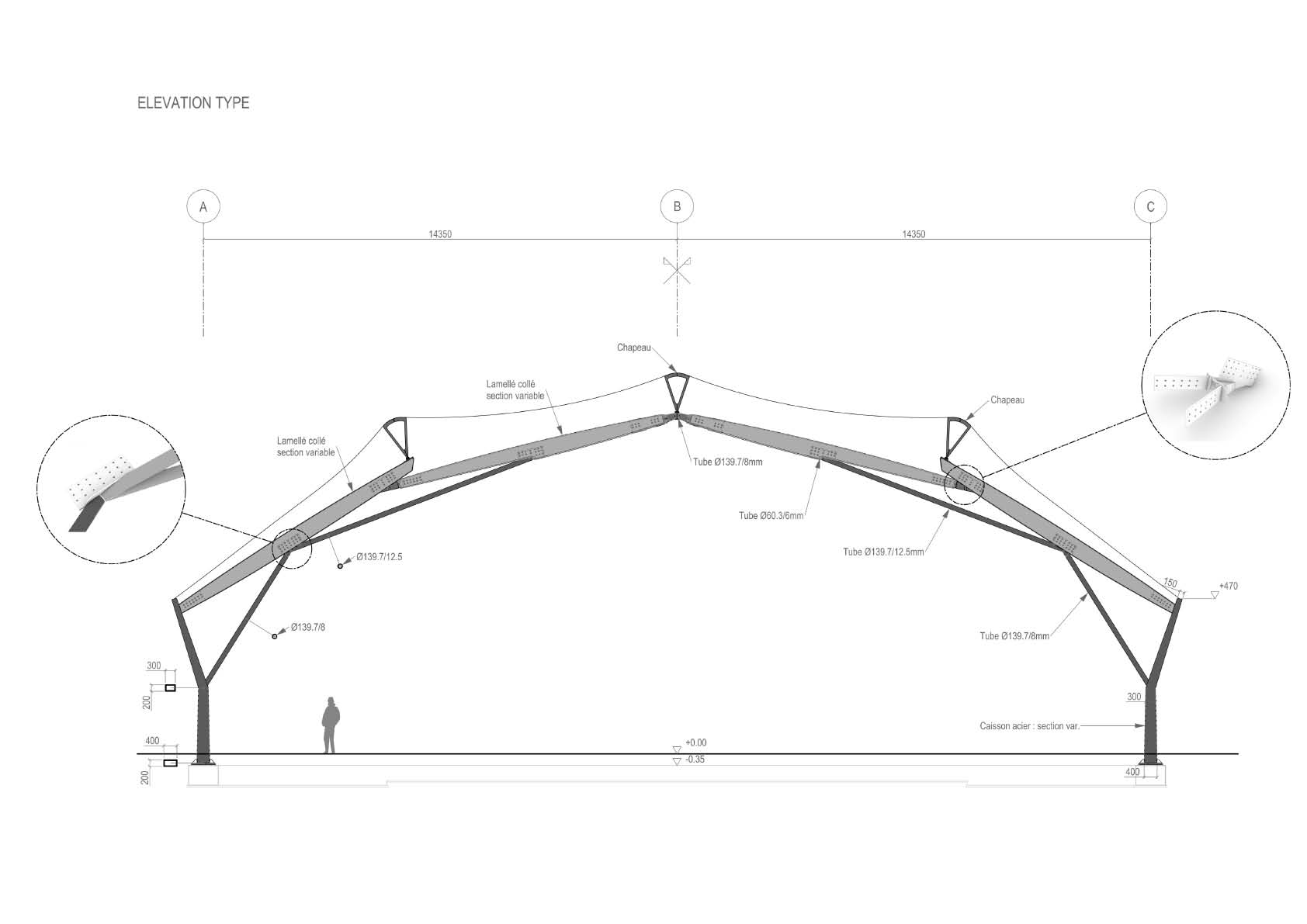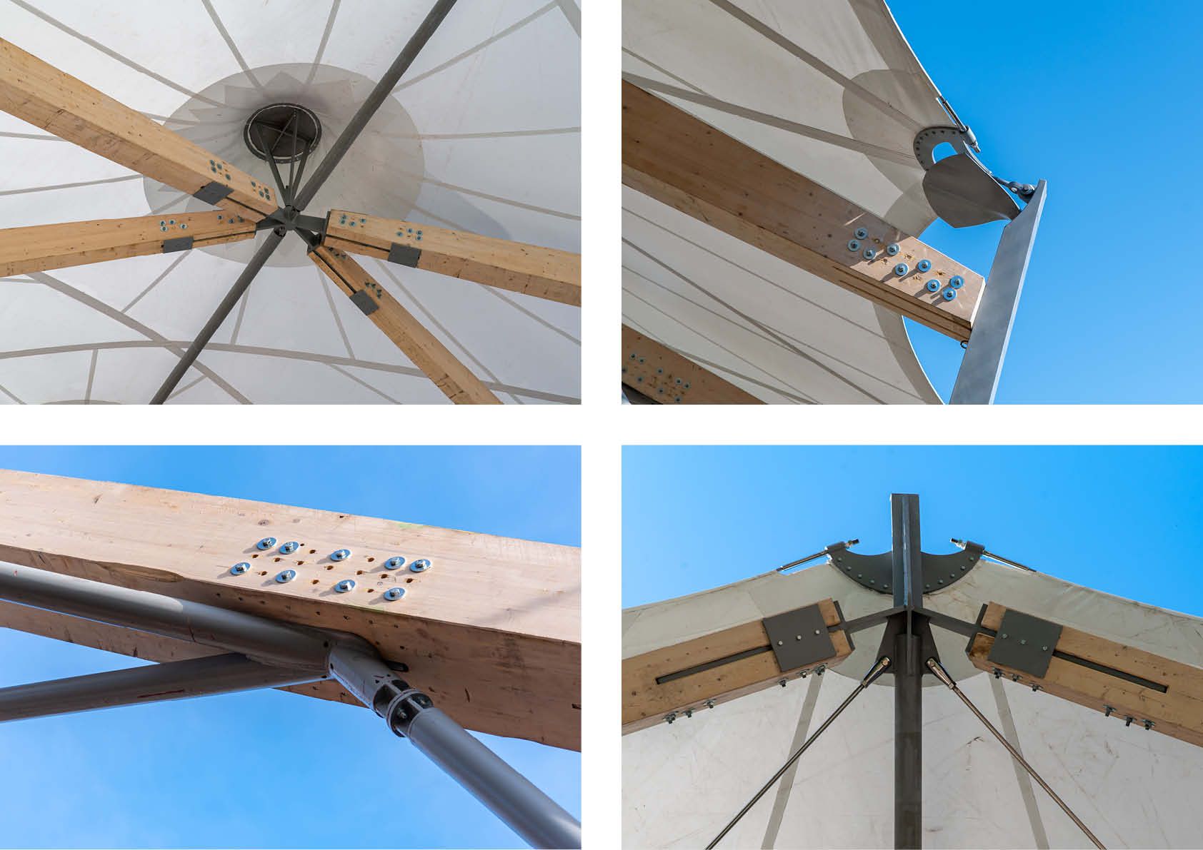 Alle andere elementen, zoals de kolommen (PRS-cassettes met variabele geometrie), de dwarsbalken en de complexe geometrische verbindingen tussen de balken zijn vervaardigd uit S355-staal. Alle portieken zijn in totaal meer dan 10 meter lang. Om esthetische redenen zijn de verbindingen tussen de houten balken onderling en die met de staalconstructie vrijwel onzichtbaar.