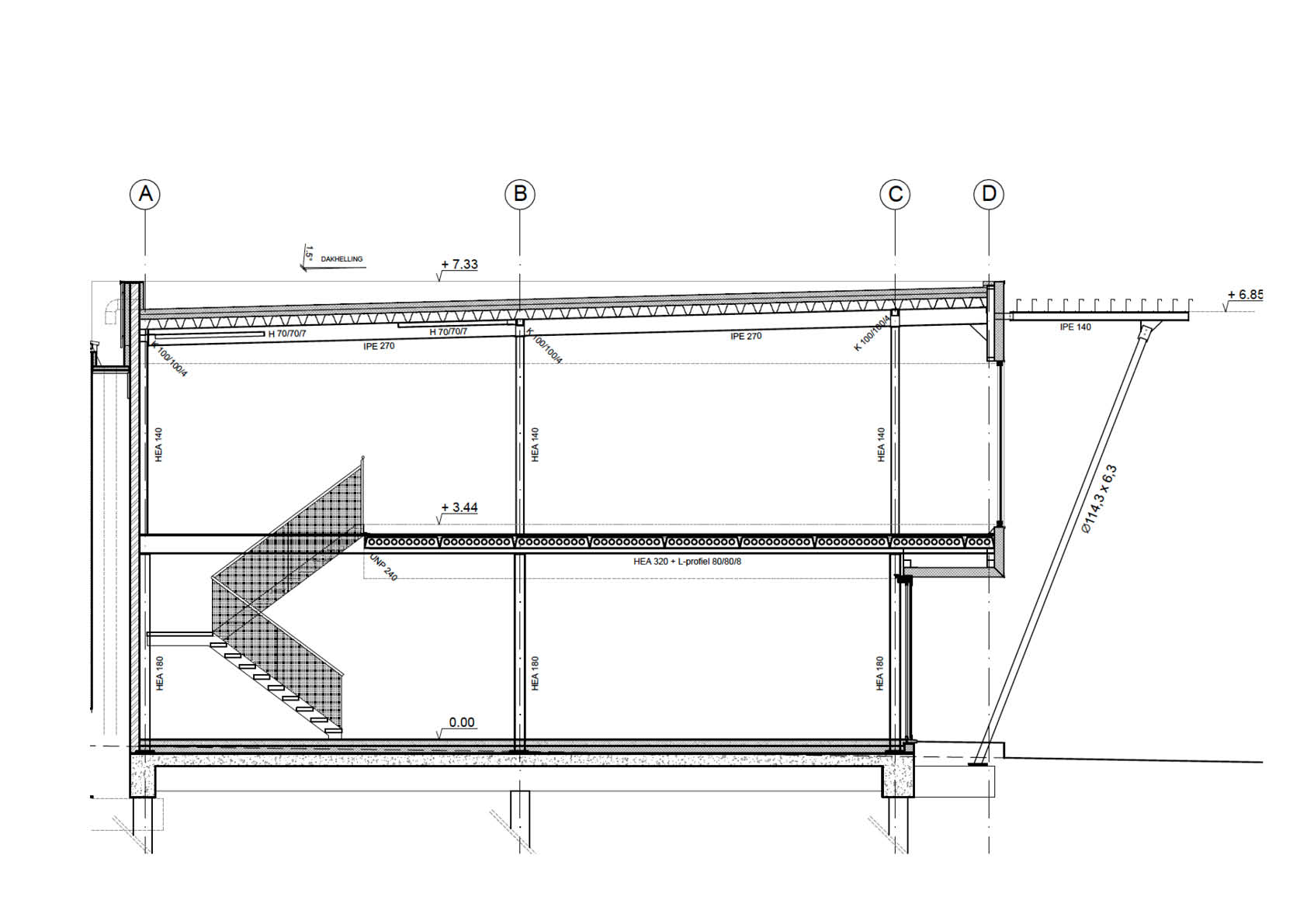Voor de lamellen zijn extra verzinkte Z-200-gordingprofielen gebruikt, die zo zijn geplaatst dat er toch voldoende lichtinval is. De schuine opstelling van de steunkolommen creëert de nodige circulatieruimte op de begane grond en geeft het gebouw een extraverte uitstraling. Gezien de grotere belastingen, vloeroversteken en mogelijkheden tot interne flexibiliteit is er gekozen voor een klassieke staalstructuur, waarbij de verdiepingsvloer tussen de liggers is geplaatst. Op het dak zijn extra stijve steeldeckplaten gelegd (153-280-840) om de te verwachten sneeuwbelasting te kunnen dragen.