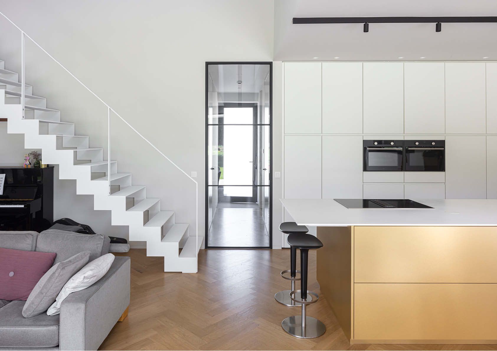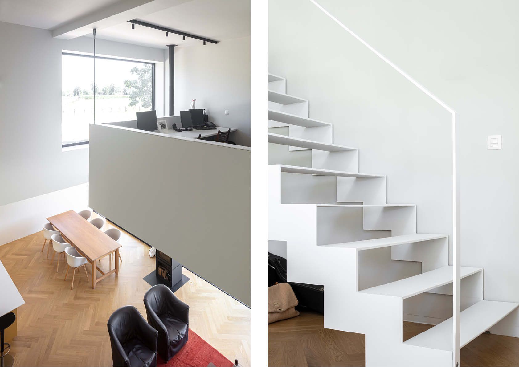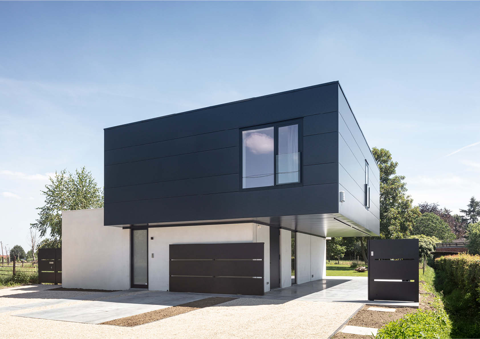 Het bovenste volume van de woning is bekleed met antracietkleurige sandwichpanelen en maakt een zijdelingse oversteek van 3,2 en 1 meter naar de straatkant. De mezzanine bestaat uit een roostering met stalen sigmaprofielen, waarvan één hoek opgehangen is met een Ø18mm-staaf. De elegante hemelse trap in de woonkamer is gemaakt van platstaal, met wanden en een onderzijde in 15 cm dikke stalen sandwichpanelen. Aan de voorkant van de woning weert een semitransparante stalen omheining met poort al te nieuwsgierige blikken.