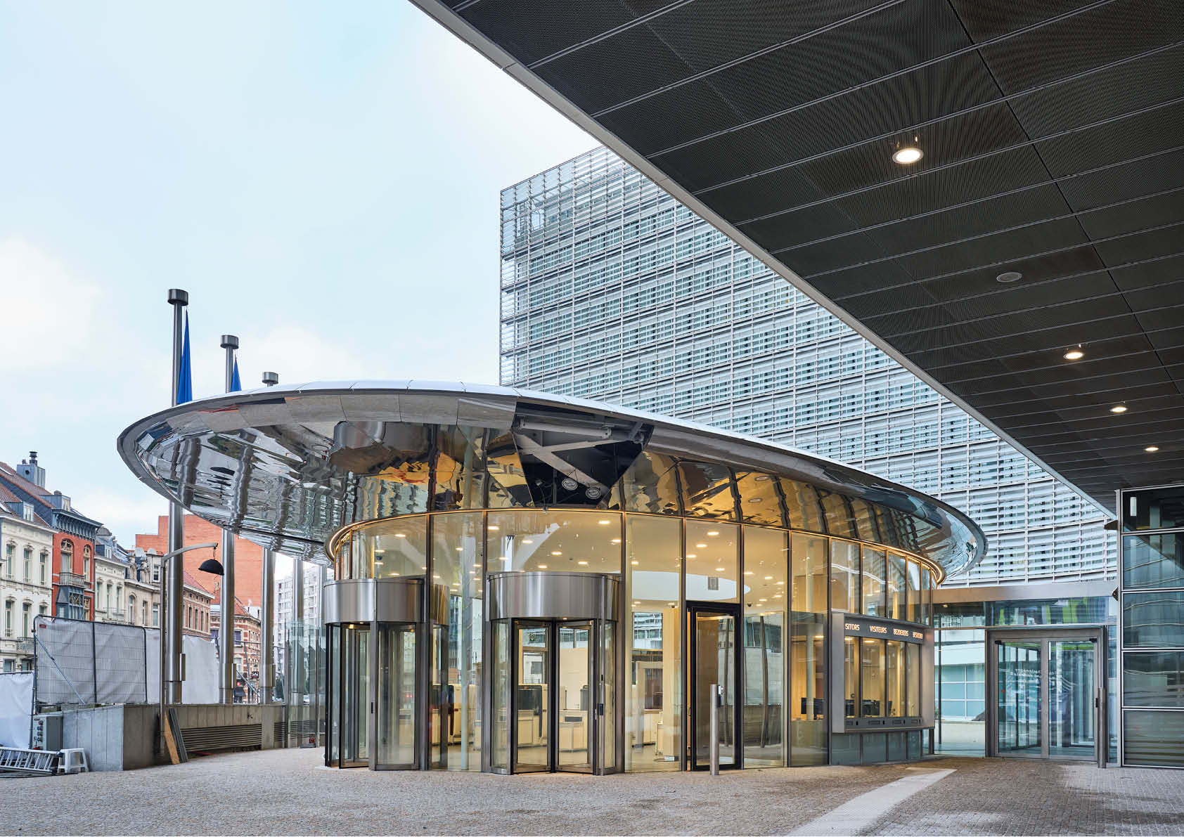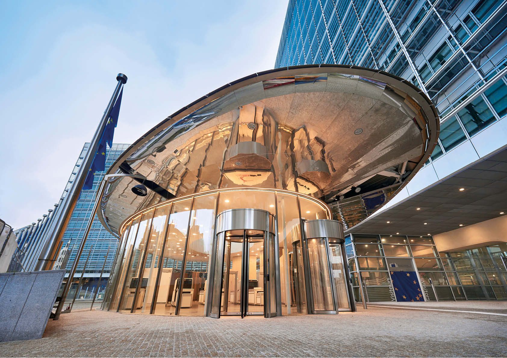 Voor de Europese Commissie in Brussel is aan de voet van het Berlaymontgebouw een ellipsvormig paviljoen opgetrokken om bezoekers te ontvangen en het terrein beter te beveiligen.