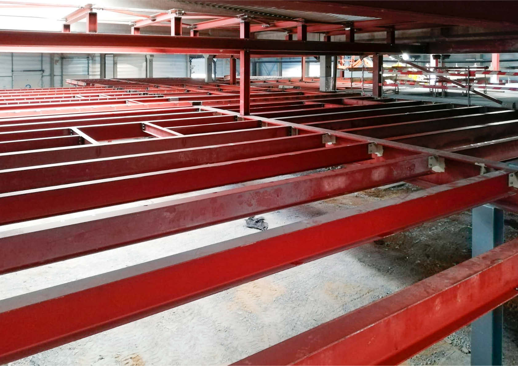 In een loods die werd aangekocht door MaSTherCell/Catalent, een farmaceutisch bedrijf dat actief is in cel- en gentherapie, werd een volledige technische verdiepingsvloer geïntegreerd op 3,2 meter hoogte – deels een roostervloer, deels een betonvloer (zwaluwstaartstaalplaat + betonvulling). Daarvoor was ook een ophangconstructie vlak onder de bestaande betonnen spanten (circa 6 meter vrije ruimte) nodig.
