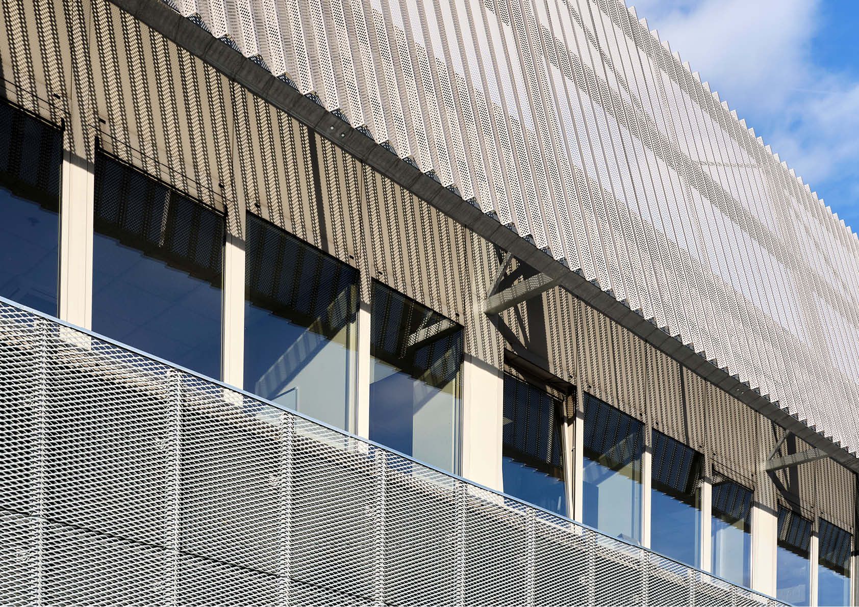 De imposante luifel bij de ingang werd afgewerkt met geperforeerde profielplaten van ArcelorMittal.