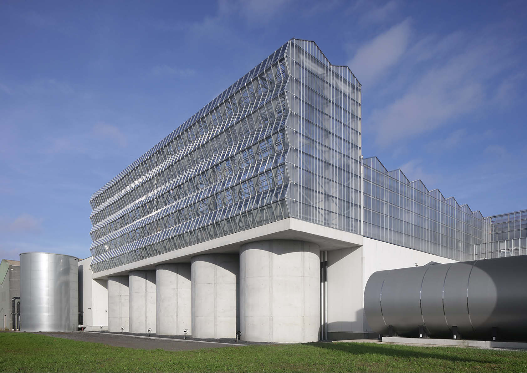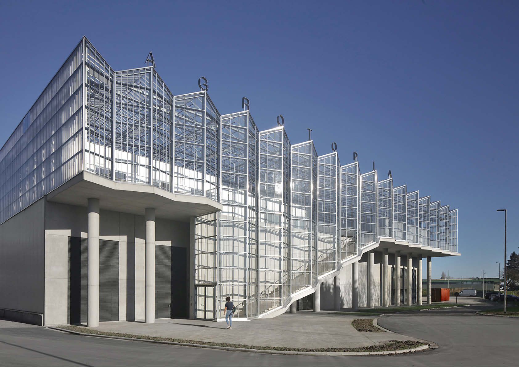 Het zijn vooral de uitkragende voor- en achterzijde van de ranke serreconstructie die in het oog springen. Aan de staart van het gebouw is een voorplein met een monumentale entreetrap voorzien. Deze laatste is 11 m hoog en lijkt te zweven, aangezien hij op 11 slanke kolommen rust. De serrekappen zijn er verticaal doorgetrokken over de gefacetteerde vliesgevel en vormen op die manier transparante erkers.