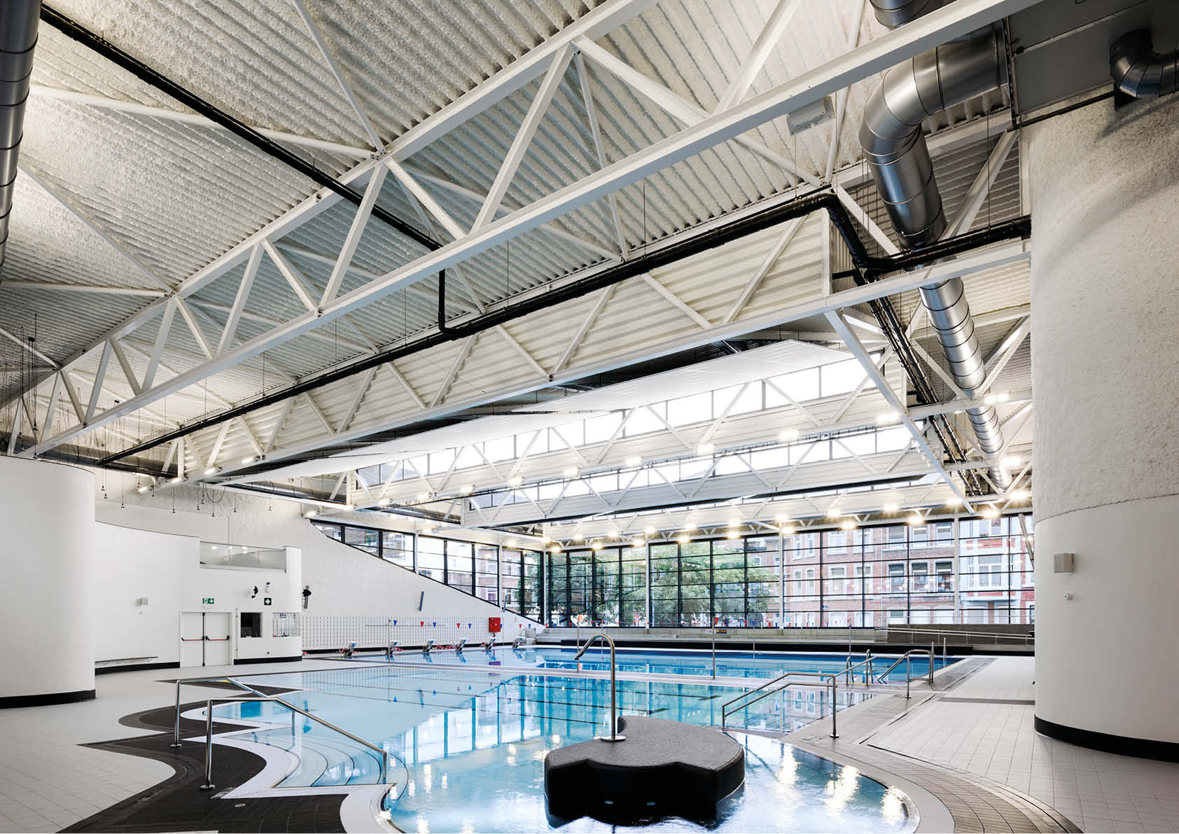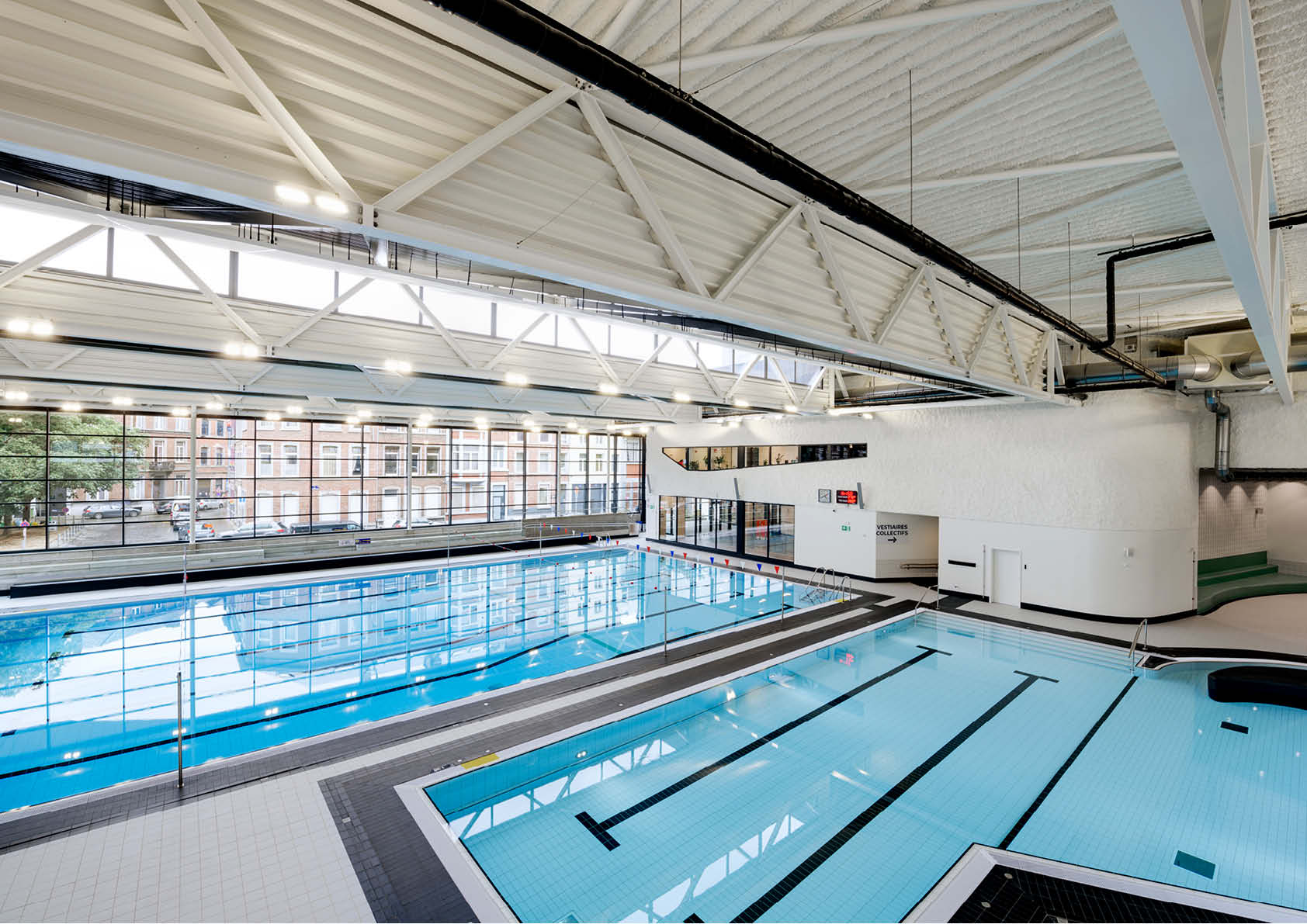 Binnenin onderscheidt het zwembad zich onder meer via contrasterende zwarte accenten op de vloer en de muren . Wat het gebouw echter helemaal atypisch maakt, zijn het sheddak en de stalen vakwerkstructuur, die ervoor zorgen dat de aanwezigen letterlijk en figuurlijk baden in natuurlijk licht.