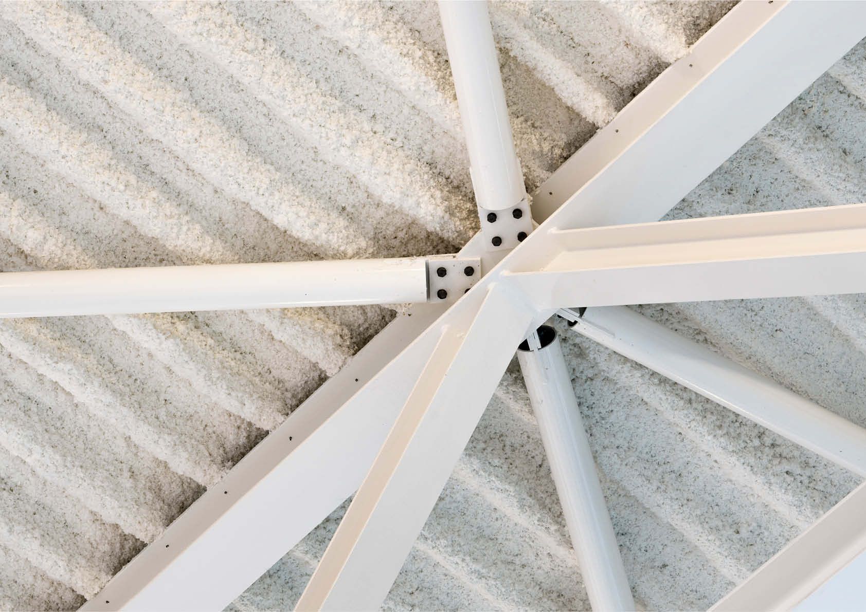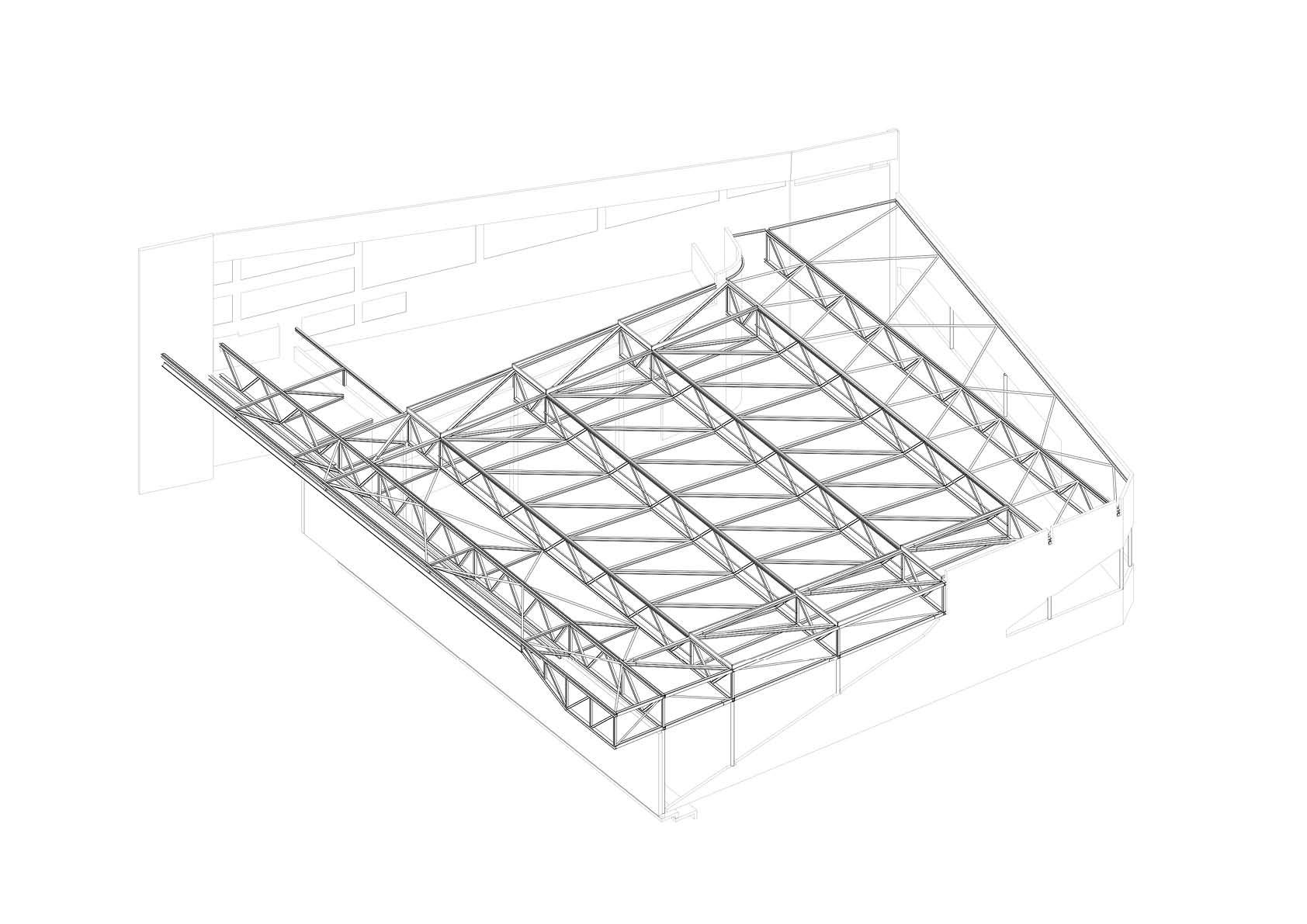 Er weden meerdere versies van het staalskelet ontworpen. Uiteindelijk werd het staalskelet opgebouwd uit standaard H-profielen. De hoofdliggers, die maar liefst 36 m lang zijn, kwamen in drie stukken toe op de werf en zijn ter plaatse geassembleerd.