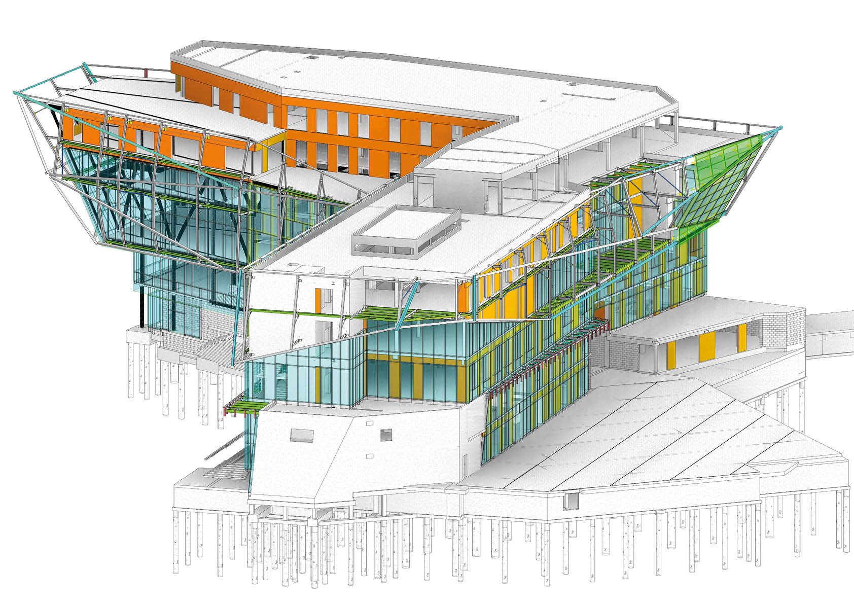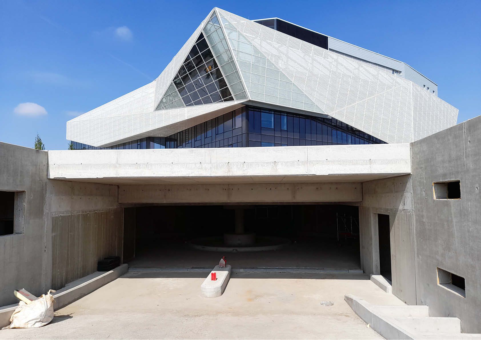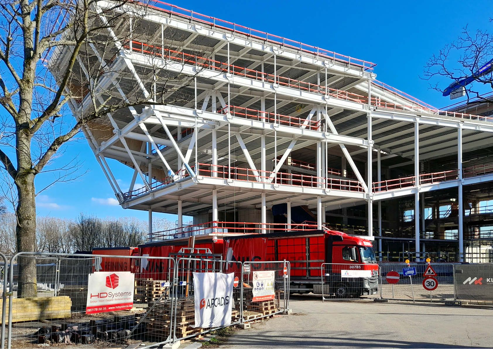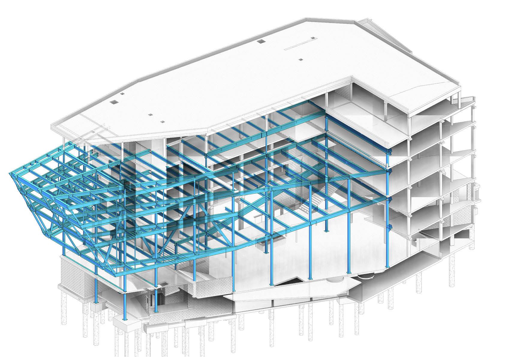 De primaire draagstructuur van de uitkraging bestaat uit drie vakwerkliggers in S355-staal, waarop om de 3 meter secundaire dwarsbalken in S235-staal rusten. Deze laatste ondersteunen de vloeren en de draagconstructie van de dubbele schil. Dankzij de keuze voor staalplaatbetonvloeren kon het dode gewicht van de structuur aanzienlijk gereduceerd worden.